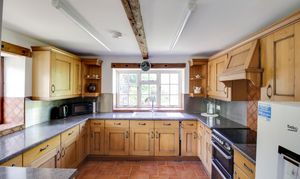Fitted kitchen comprising work surfaces with Oak Shaker style drawers and cupboards under. Wall mounted cupboards. Electric cooker with extractor fan over. Space for fridge/freezer. Double bowl ceramic sink with mixer tap and tiled splash backs. Windows to front and side.