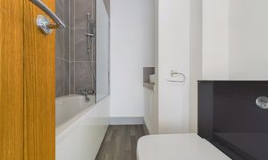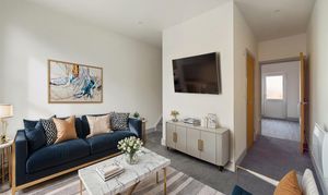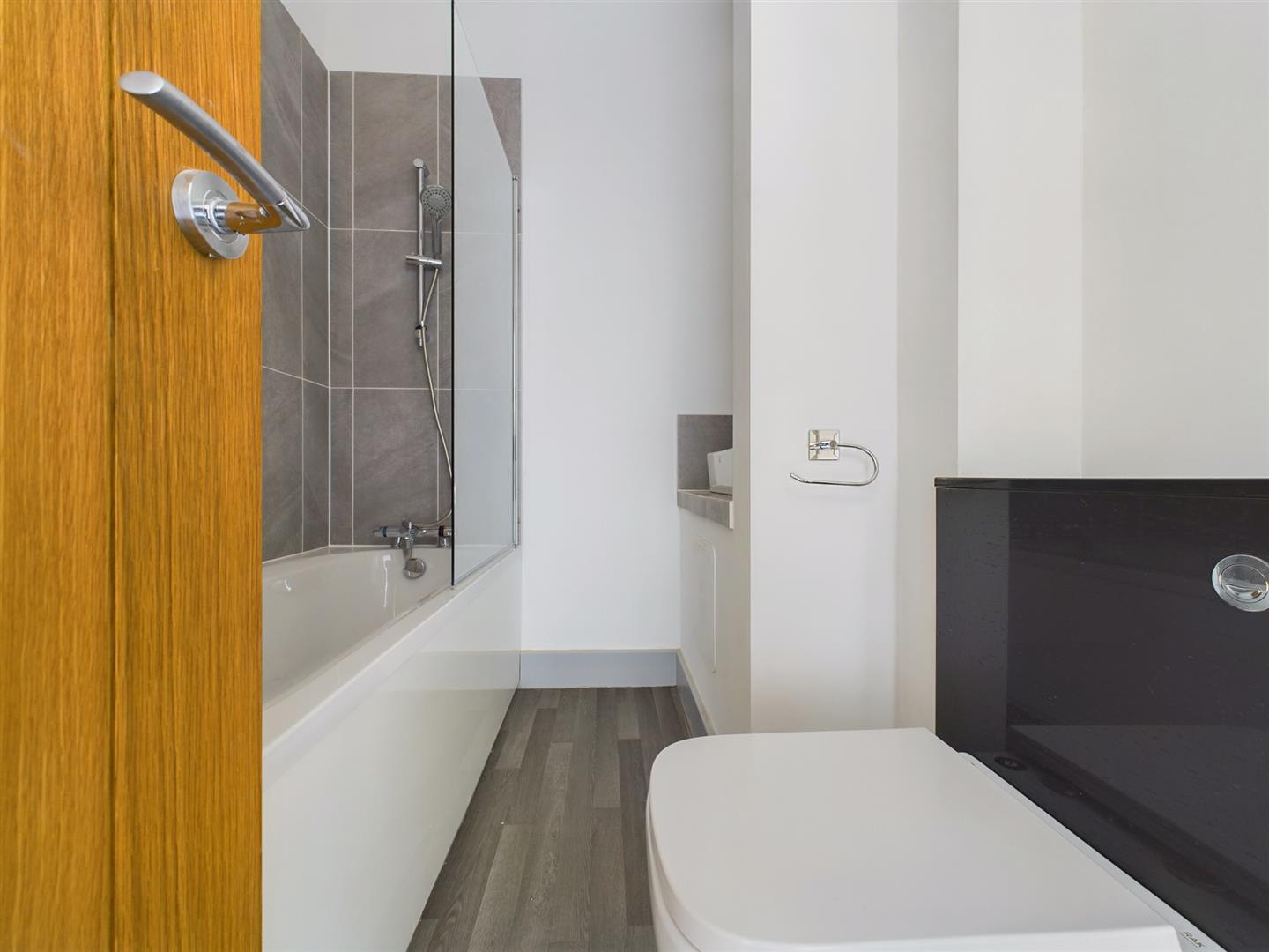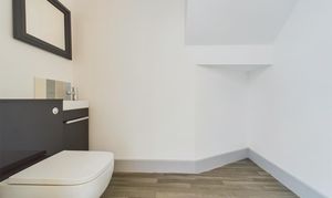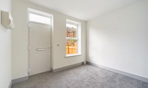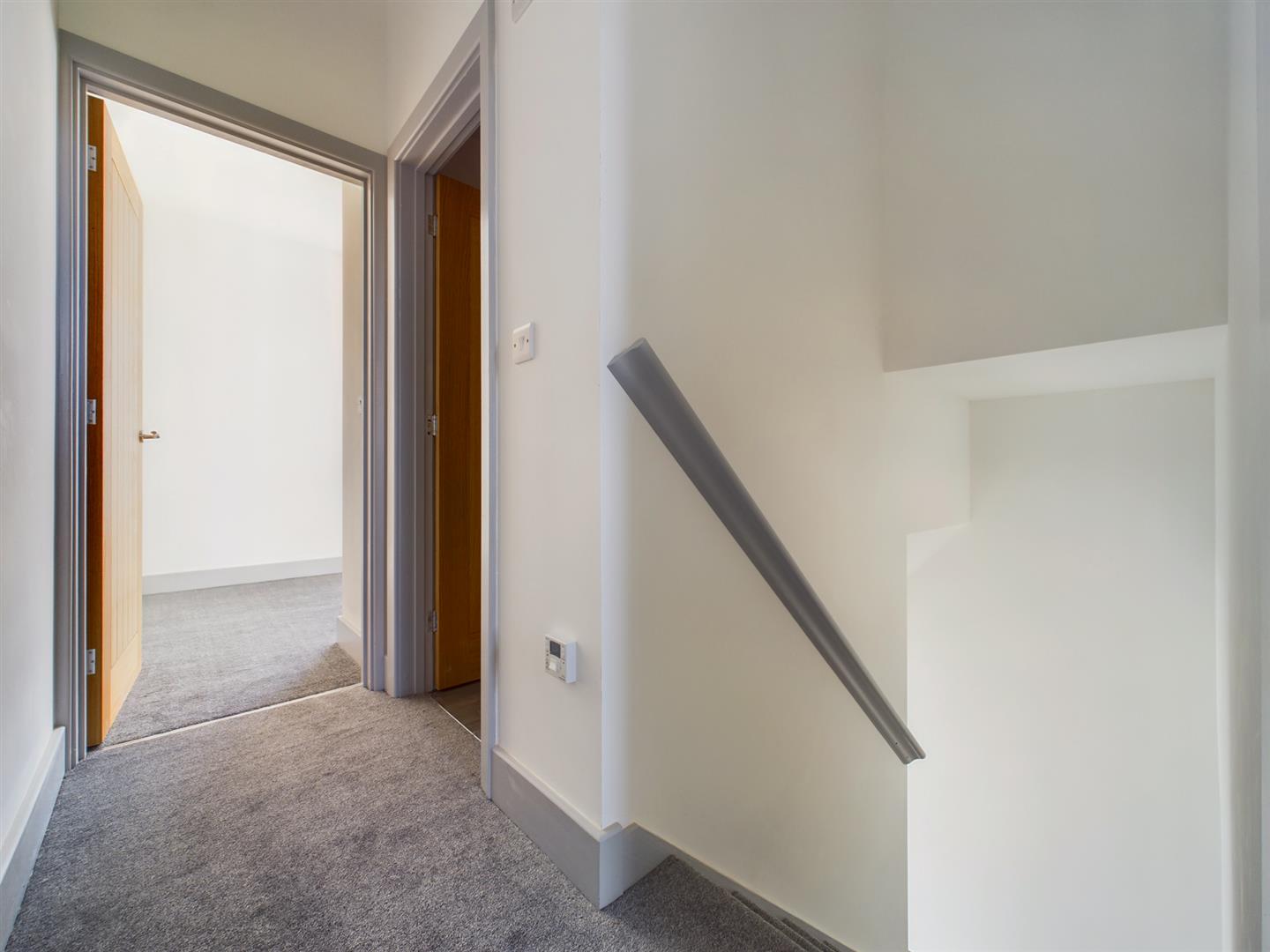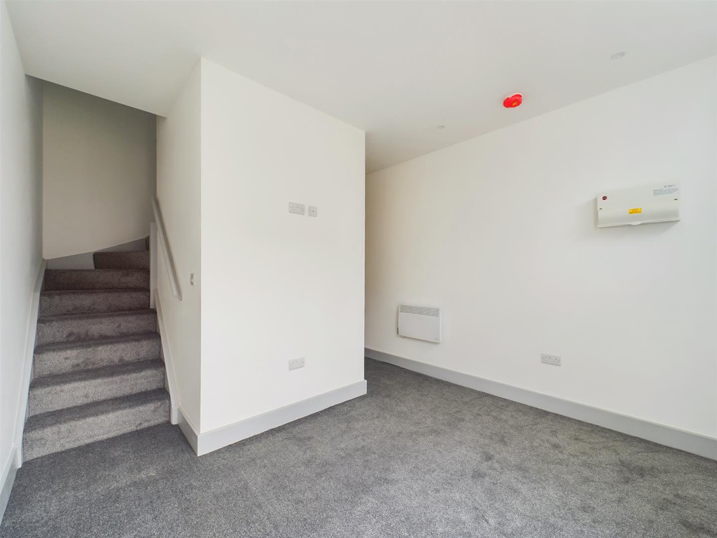 The main entrance opens to a bright living room, thoughtfully designed with an eye-level socket for a wall-mounted TV. The ground floor also features a cloakroom/WC, complete with a modern suite and chrome towel radiator. The contemporary kitchen includes a generous range of fitted units and integrated appliances such as an electric oven, hob with extractor, fridge/freezer and washing machine. From the kitchen, a door leads to a low-maintenance, courtyard-style garden.