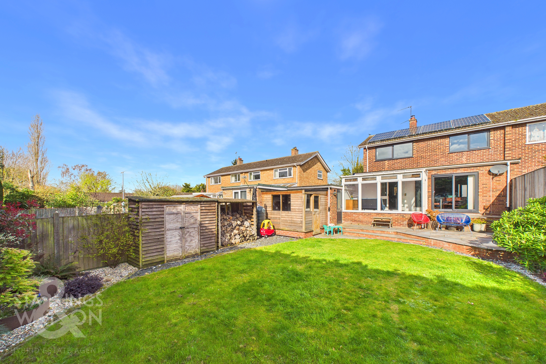 Enjoying an ENVIABLE POSITION OVERLOOKING a COMMUNAL GREEN, this EXTENDED SEMI-DETACHED HOME offers approximately 1273 sq. ft (stms) of beautifully presented accommodation, perfectly suited to MODERN FAMILY LIVING. The welcoming hall entrance features practical BUILT-IN STORAGE, leading through to an IMPRESSIVE 19' OPEN PLAN SITTING/DINING ROOM, flooded with natural light courtesy of wide patio doors that open directly onto the rear garden. The adjacent 18' KITCHEN is thoughtfully designed, providing generous worktop space and cabinetry, with a versatile INNER HALL/STUDY AREA and convenient W.C. The property further benefits from a 12' CONSERVATORY with FULL HEIGHT WINDOWS and FRENCH DOORS, seamlessly blending indoor and outdoor living. Upstairs, THREE well-proportioned BEDROOMS await, all serviced by a STYLISH FAMILY BATHROOM complete with ATTRACTIVE TILING and a contemporary RAINFALL SHOWER. Additional highlights include INCOME GENERATING SOLAR PANELS, enhancing the home’s efficiency and appeal. The rear garden is FULLY LANDSCAPED, beginning with a generous patio area that flows directly from both the conservatory and sitting room, creating the perfect environment for alfresco dining and entertaining. Stepping down, a lush lawn is framed by mature planting and shrubbery, with TIMBER PANEL FENCING and dense hedging along the rear boundary ensuring a HIGH DEGREE OF PRIVACY. At the far end of the garden, a second patio seating area provides a tranquil retreat, accompanied by a TIMBER BUILT STORAGE SHED, handy LOG STORE, and a DEDICATED WORKSHOP for hobbies or additional storage. The GARAGE is equipped with an ELECTRIC ROLLER DOOR, side access, power, and lighting,