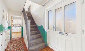 Once inside an attractive meet and greet space with wood effect flooring can be found, with stairs rising to the first floor landing and useful built-in storage cupboard space below. A part-glazed door leads off to the kitchen whilst a further door takes you to the main living space. Fully open plan as a sitting/dining room with views across the rear garden via the rear facing sliding patio doors, a cast iron wood burner creates a focal point to the room with a tiled hearth and herringbone style flooring underfoot. There is ample space for soft furnishings and a dining table, with a further part glazed door taking you to the adjacent kitchen - with the u-shaped arrangement of wall and base level units including integrated cooking appliances, with an inset gas hob and built-in electric double oven with tiled splash-backs and extractor fan. The front facing window floods the room with natural light with space provided for a fridge freezer, washing machine and dishwasher. Tiled effect flooring flows underfoot with a door taking you to an inner lobby which creates the ideal home office or study space, with built-in storage and work surface, with double doors taking you to the conservatory. A further door leads off to ground floor W.C with a white two piece suite including a side facing window, tiled splashbacks and wood effect flooring. The conservatory extends the living space with French doors leading out to the rear garden, where full height windows offer attractive views across the garden, with tile floor underfoot. This easy to maintain room offers a versatile range of uses.