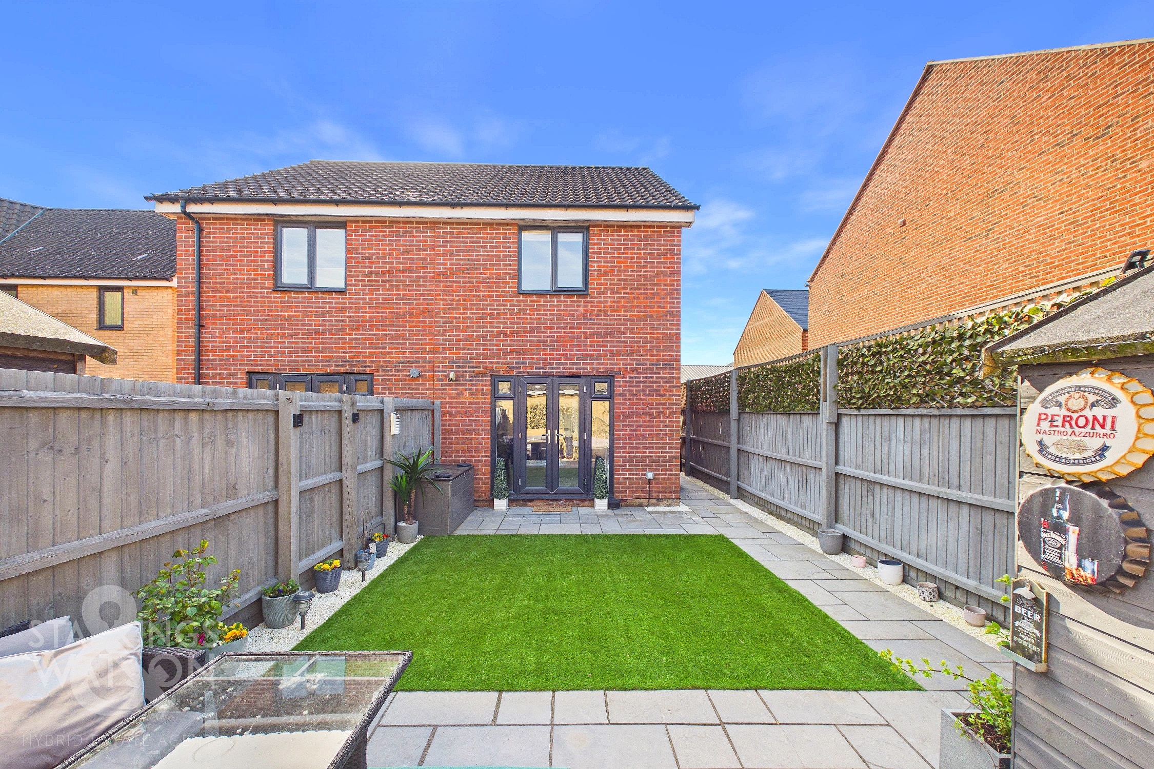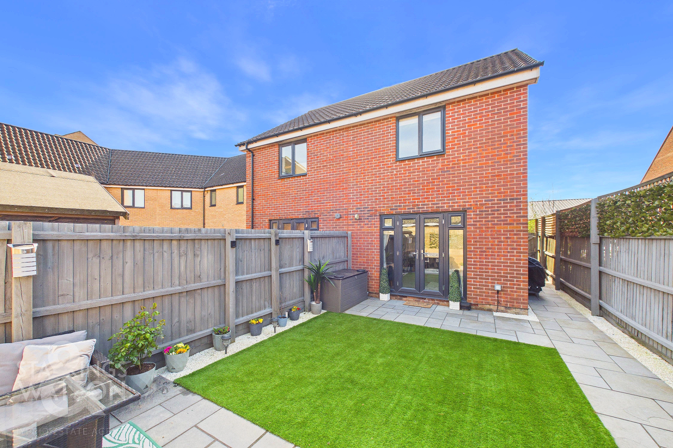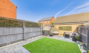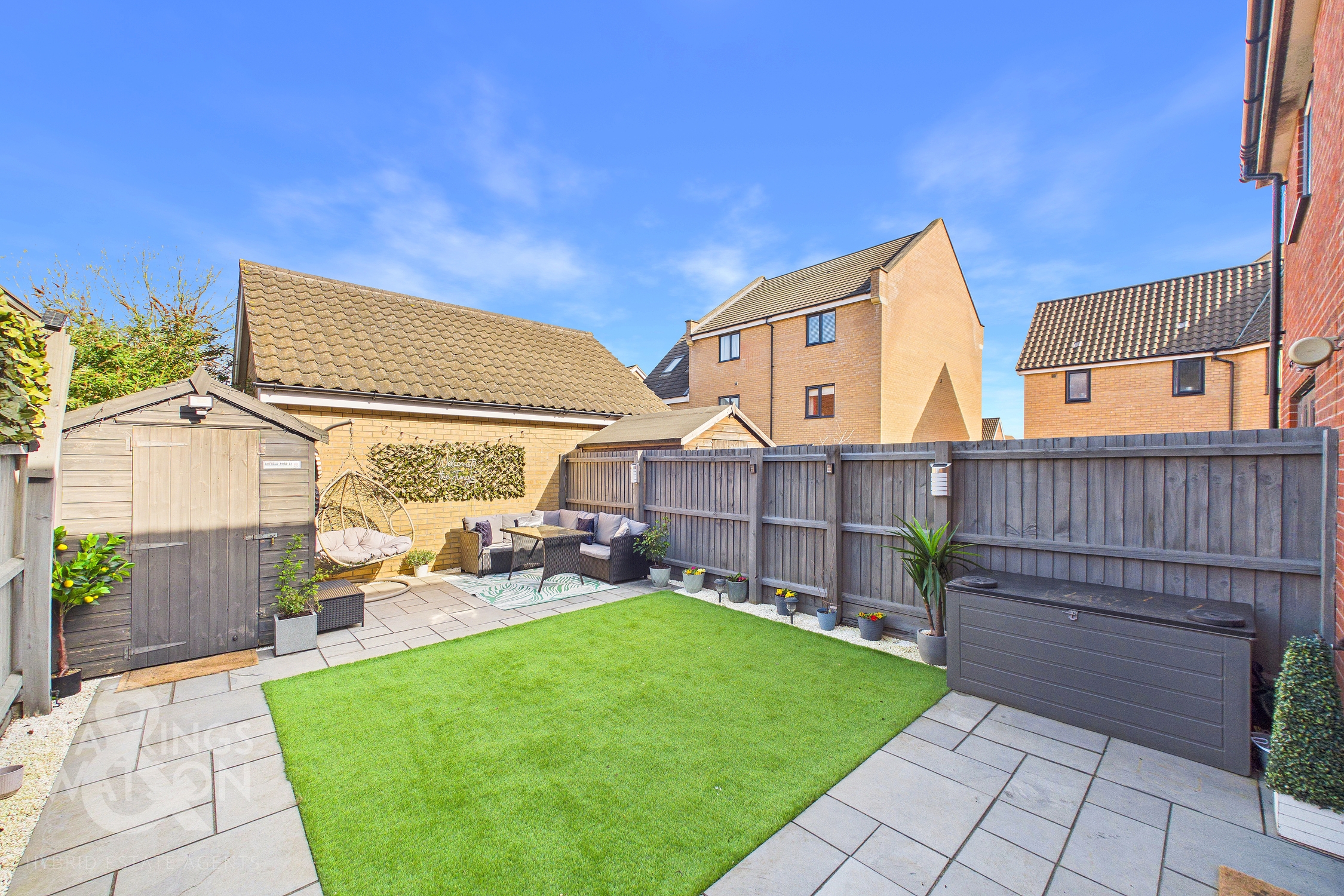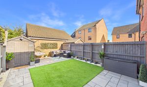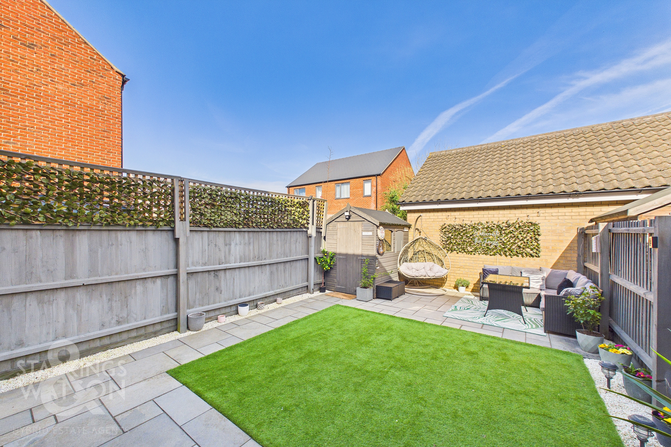 THE GREAT OUTDOORS Stepping outside, the private rear garden is fully enclosed by timber panel fencing and opens onto a recently laid flagstone patio. The patio wraps around the side of the home, leading to a wooden latch and brace gate that provides convenient access to the driveway and the front of the property. The remainder of the garden is predominantly laid to low maintenance synthetic grass, while a second large flagstone patio at the far end offers ample room for outdoor furniture to enjoy the summer months. A timber shed is also located at the foot of the garden, providing practical storage space.
