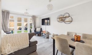 Stepping inside the light and bright hallway entrance, stairs to the first floor and an adjacent two piece W.C provides practicality for family living or guests. The space opens into the fully fitted kitchen, offering plentiful storage from a range of wall and base units with wrap around worktops providing ample space for food preparation. Integrated appliances also feature, including a double oven, inset electric hob, and a fitted extractor overhead, with further space for a freestanding ‘American style’ fridge freezer and undercounter space/ plumbing for both a washing machine and a dishwasher. Wood effect flooring runs underfoot and continues into the rear facing 14’ sitting and dining room. In the corner, a deceptively sized under stairs cupboard provides plentiful storage for coats and shoes, while the main living area offers versatility for various soft furniture layouts and a formal dining table. Large uPVC double glazed French doors overlook the rear garden and open directly onto the patio, providing a seamless transition between inside and out. Ascending to the carpeted first floor landing, loft access is available overhead and doors give way to two double bedrooms. To the left, the main bedroom features carpeted flooring and ample space for a large double bed, storage furniture, and a vanity desk. Across the hall, the second double bedroom is currently used for a home business and benefits from mirrored sliding wardrobes and a tucked away airing cupboard.