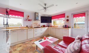 Stepping inside and a large central hallway space greets you initially allowing access and space for those with potential mobility issues. Two large double bedrooms can be found towards the front of the home. The first to your right courtesy of a historic extension has a large bay fronted window towards the front of the home allowing natural light to flood the room with wall to wall mirrored fitted wardrobes and wood effect flooring. The adjacent side of the property currently houses a similarly sized bedroom again with large bay fronted double glazed windows to the front and fitted wardrobes leaving ample room for a large double bed and other soft furnishings. The shower room sits just off from the entrance lobby, a multi-functioning room complete with a wide range of vanity and additional storage working as a utility room with wall mounted radiator and walk in rainfall shower cubicle. Towards the end of the hallway and turning to your left, the dual aspect kitchen encapsulates the flawless views over the fishing lakes beyond with wood effect work surfaces giving way to a wide range of wall and base mounted storage units housing integrated appliances which include a four ring gas burner hob with extraction above, dual eye level ovens, fridge/freezer and dishwasher. The tiled floor space leaves room for a breakfast bar with access door leading you directly onto the rear garden. The main living space in this property is situated to the rear of the home with a 19’ sitting and dining room complete with wood flooring laid underfoot. This open floor space allows for a choice in layout of soft furnishings to accommodate both a sitting and dining room suite separately whilst through the uPVC double glazed French doors you will find yourself within the garden room currently used as the dining room with warm roof ceiling and double glazing surround.