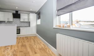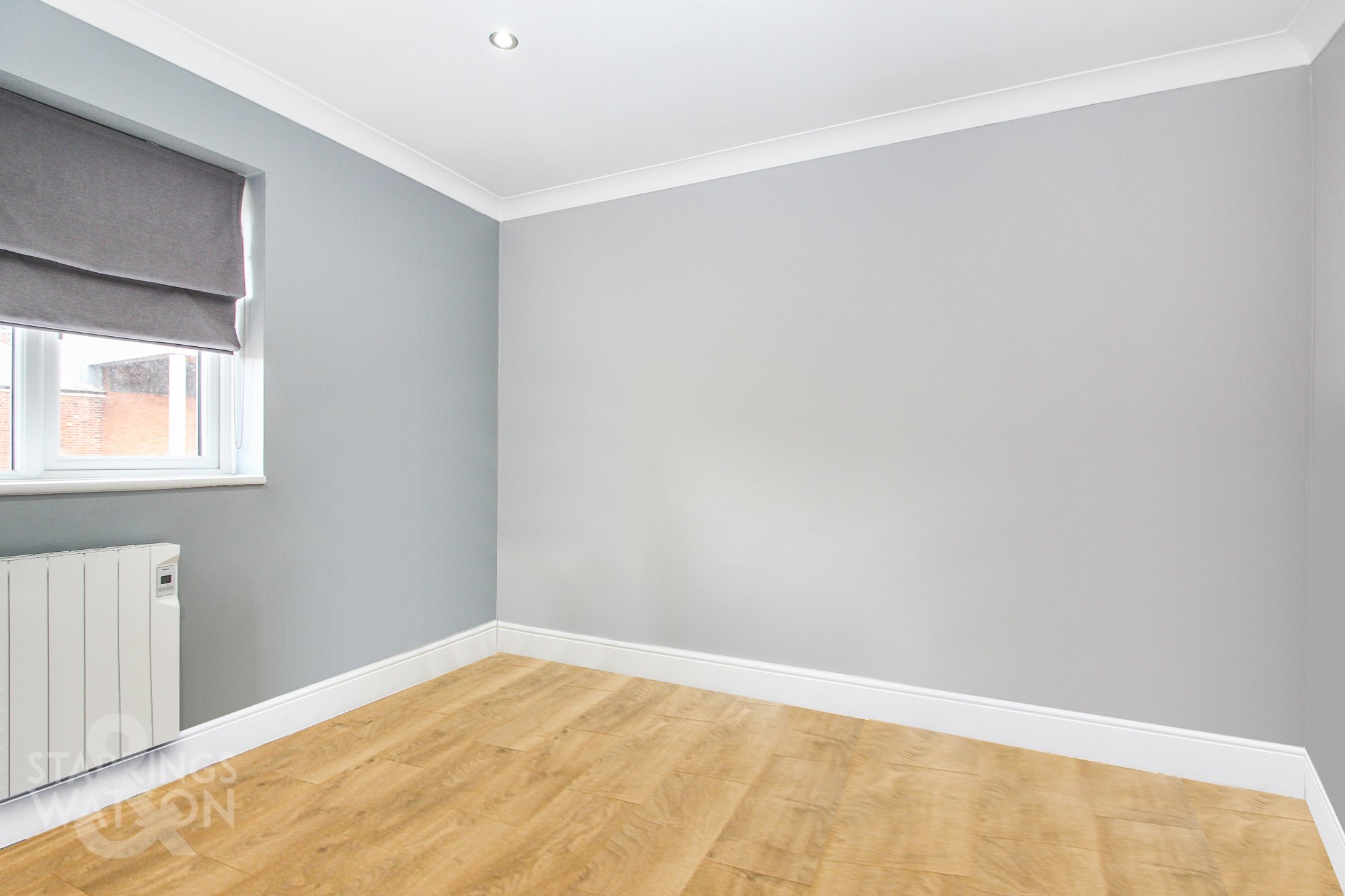 Wood effect flooring, wall mounted electric heater x2, uPVC double glazed window to front, television point, smooth coved ceiling with recessed spotlights, opening to: