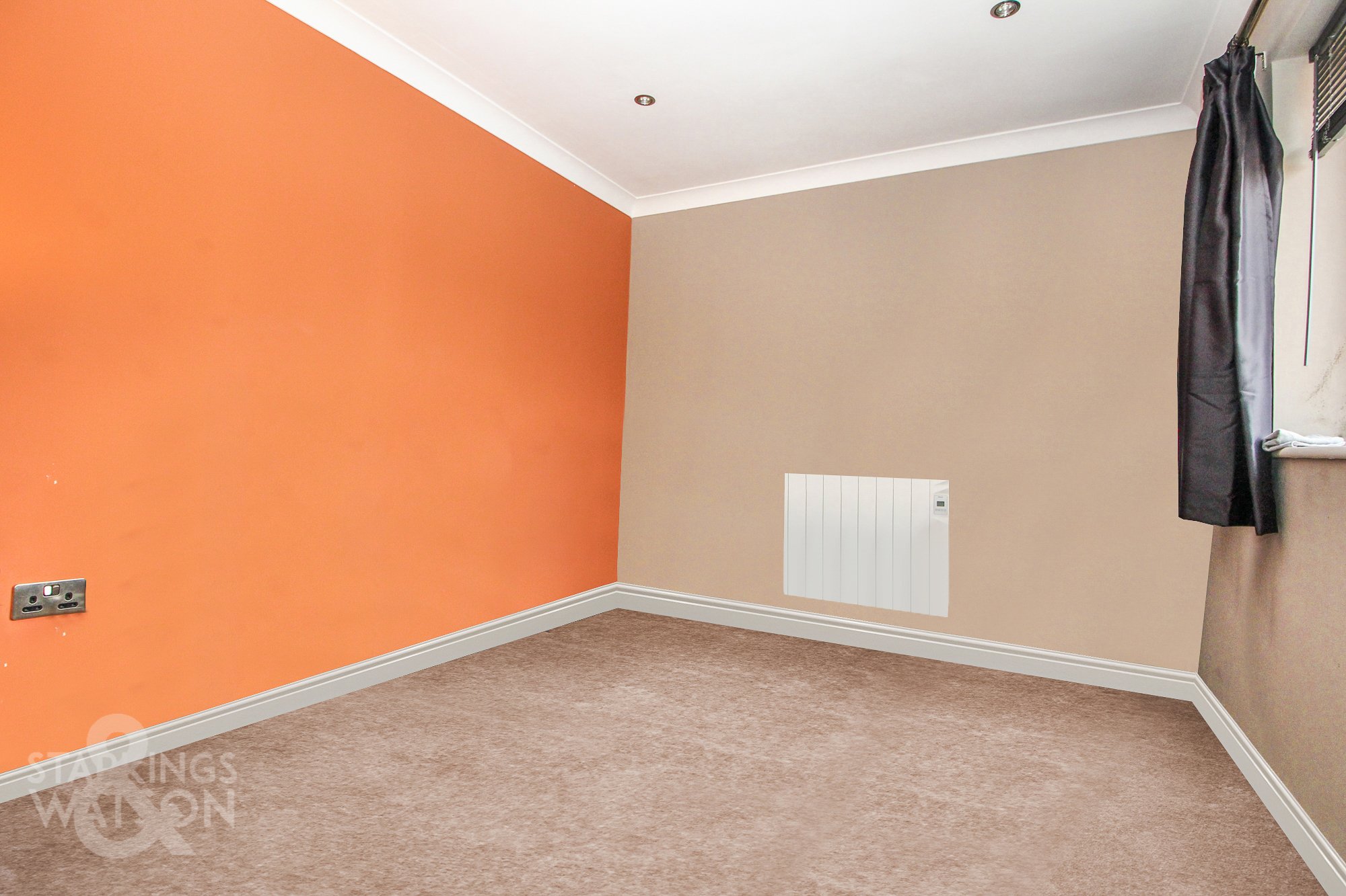 Fitted carpet, wall mounted electric heater, uPVC double glazed window to rear, smooth coved ceiling with recessed spotlights.