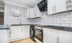 Fitted range of wall and base level units with square edged work surfaces and inset sink and drainer unit with mixer tap, tiled splash backs, inset electric ceramic induction hob, built-in electric oven and extractor fan over, integrated fridge freezer, space for washing machine, space for breakfast table, wood effect flooring, uPVC double glazed window to front, smooth coved ceiling with recessed spotlights.