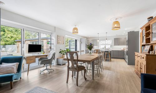 The kitchen/diner offers a beautiful dining area with space for a large dining table and is with French doors leading out to the garden and providing plenty of natural light. The kitchen offers a variety of contemporary matching wall & base cupboards with drawers and work surfaces over, inset sink with drainer, space for fridge/freezer and dishwasher, electric oven and gas hob with extractor hood above and modern tiled splash backs.