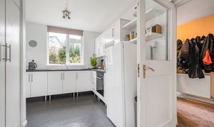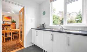 The kitchen offers a range of base and wall units, as well as built in pantry cupboards, built in oven and hob with extractor over, inset sink with mixer tap over.