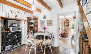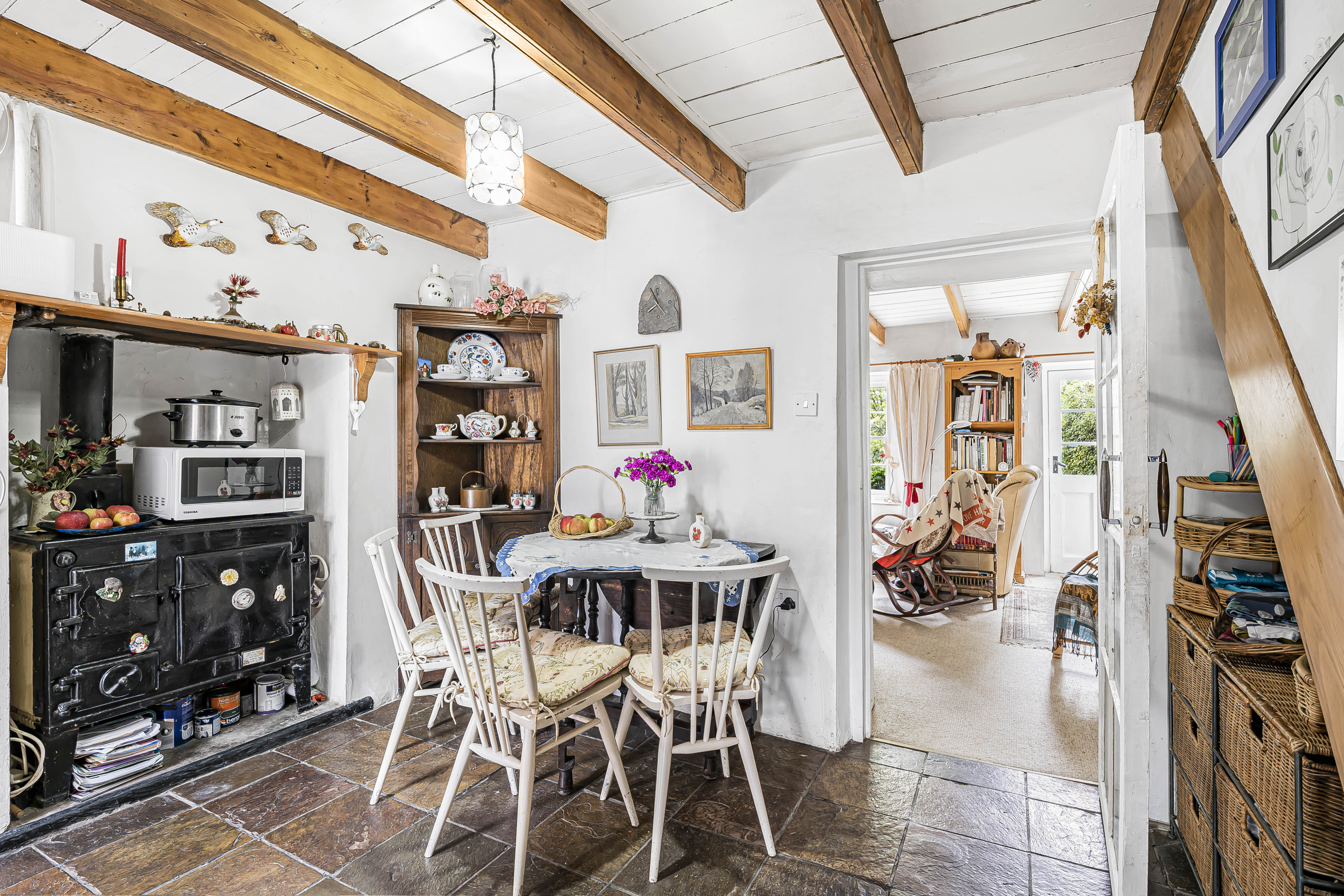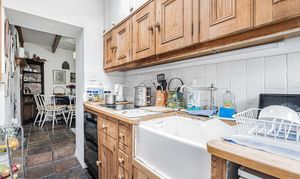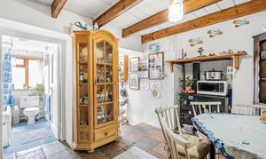 Doorway through into the dining room with stairs to the first floor, beamed ceiling and access to the galley kitchen which has a Belfast sink unit, slimline dishwasher, electric hob, and electric oven.