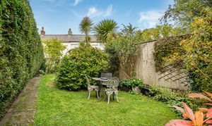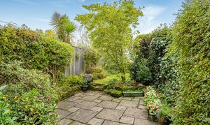 To the front the beautiful garden, well stocked with an abundance of mature shrubs, trees and flower beds along with seating areas to take advantage of the sun throughout the day. Gated to the front.