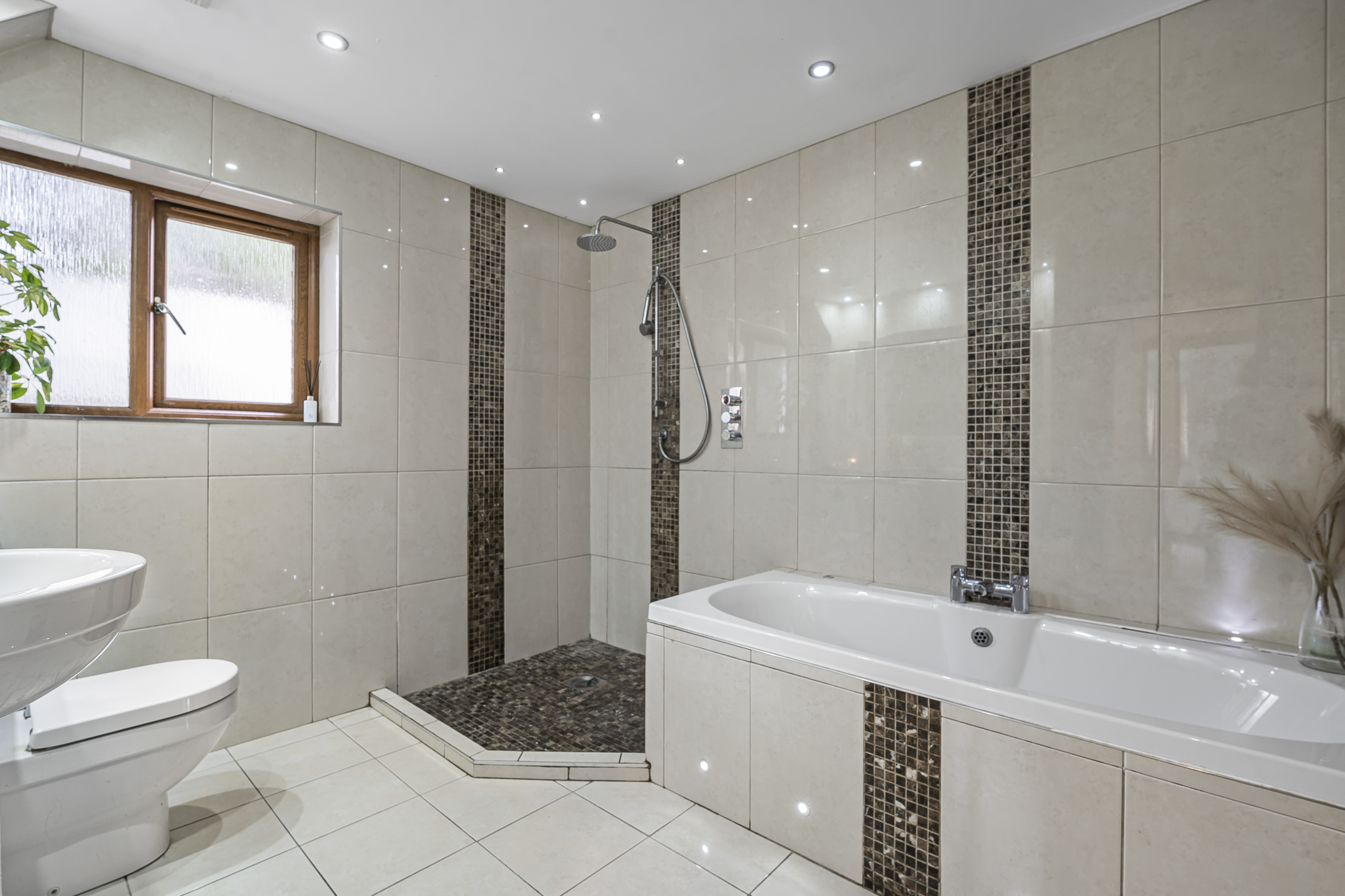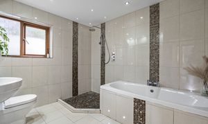 The ground floor boasts three double bedrooms and the family bathroom. The family bathroom has a four-piece bathroom suite, comprising large bath with tiled surround and inset LED lighting, generous size shower with large rain shower head and further attachments. Fully tiled from floor to ceiling, WC and handbasin all built in with Vanity units and storage cupboards, shaver point, large mirror, inset LED lighting, underfloor heating, obscure double glaze UPVC window to side elevation.