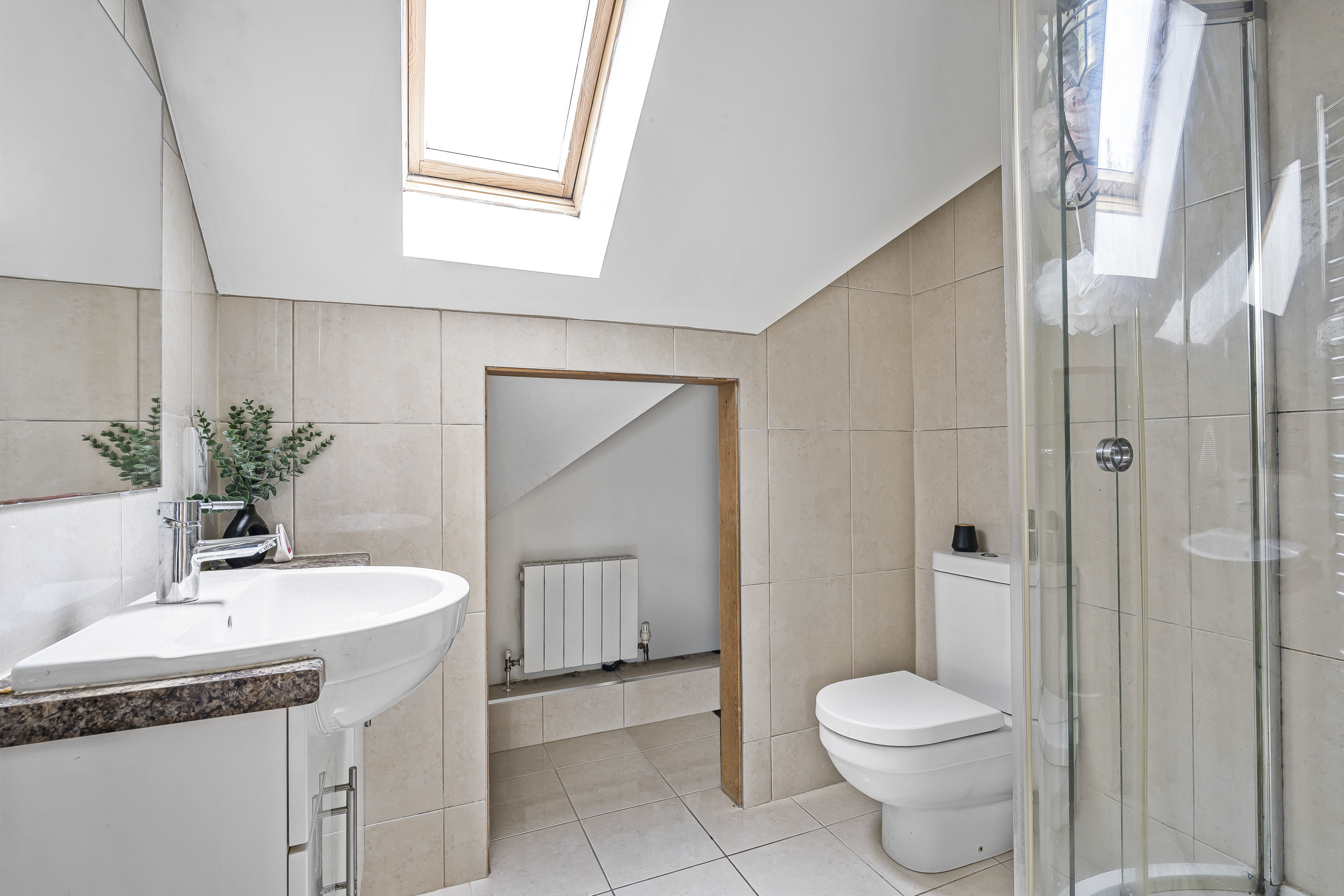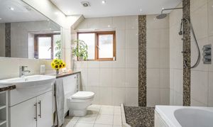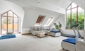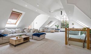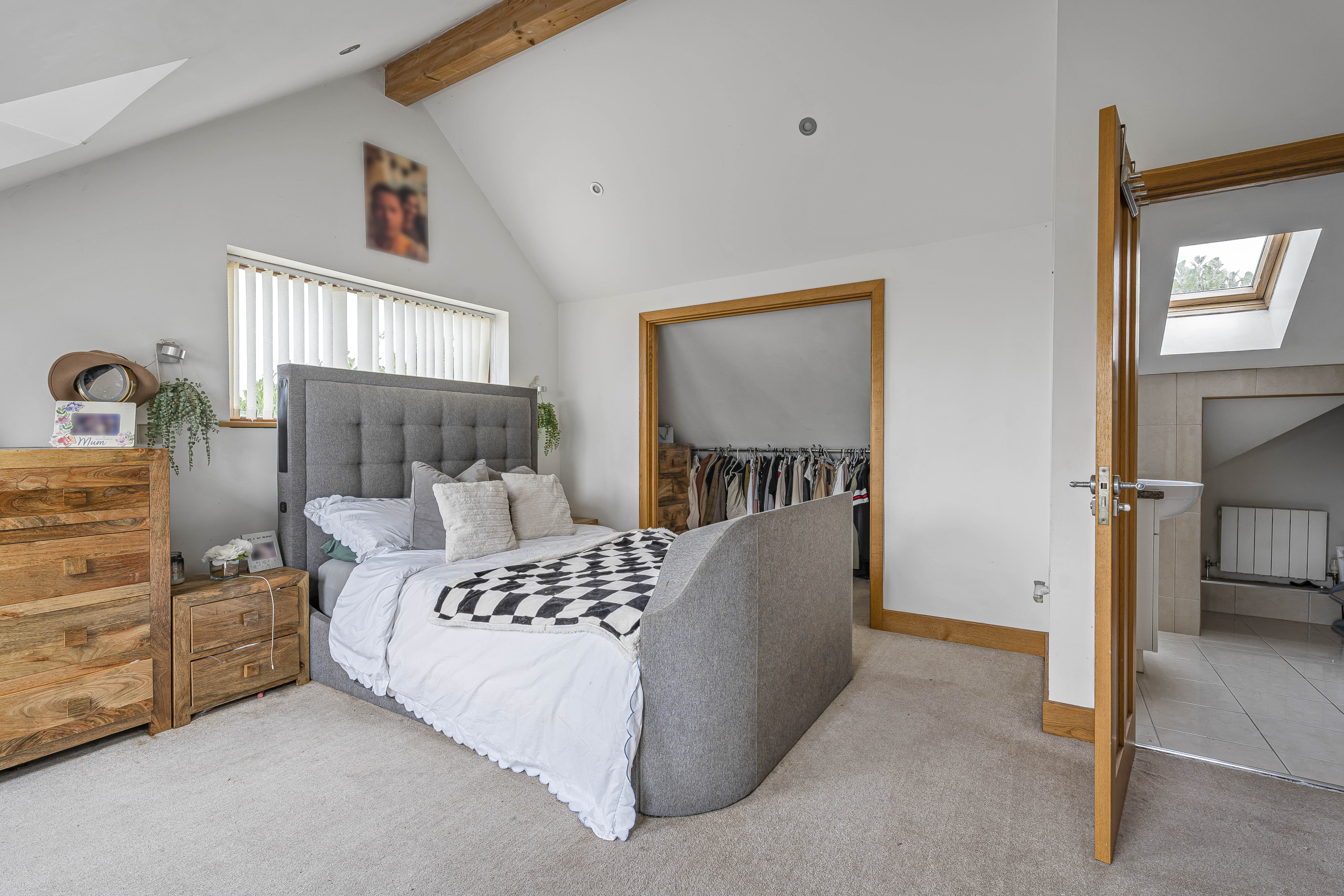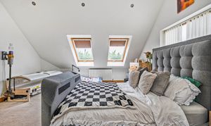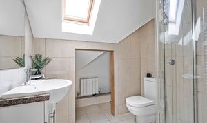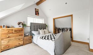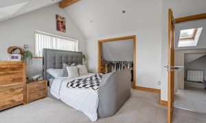 The first floor offers the stunning principal bedroom of dual aspect design. Two large Velux windows and a further poster window give plentiful natural light. The en-suite shower room is superbly designed with large quadrant shower cubicle, low level W.C, wash hand basin, and obscure window.