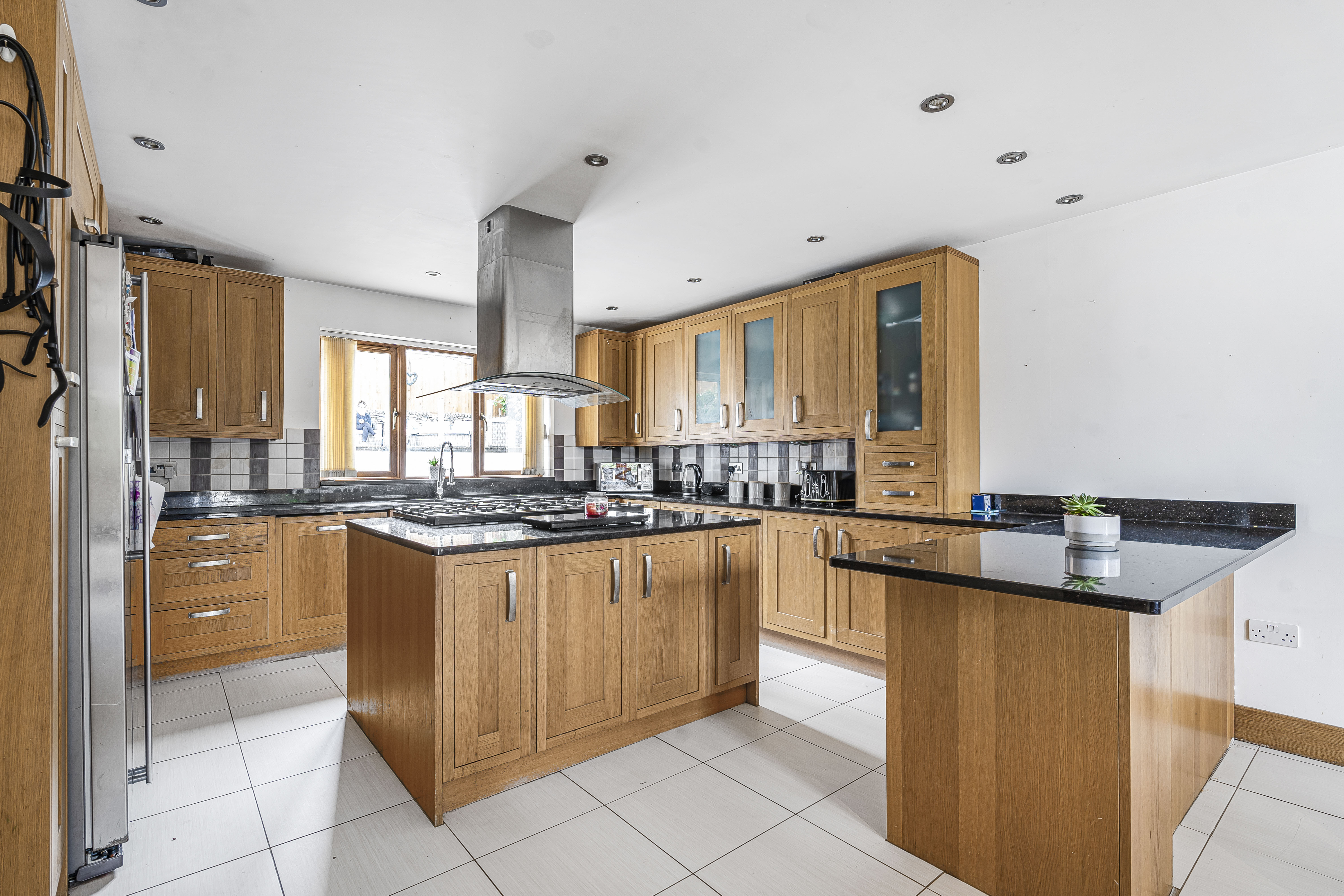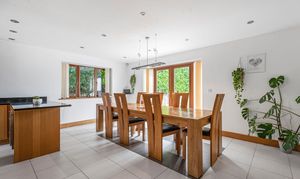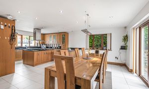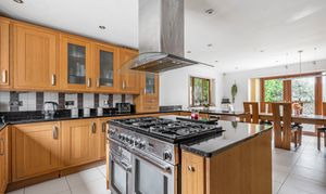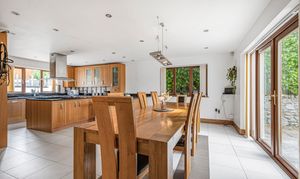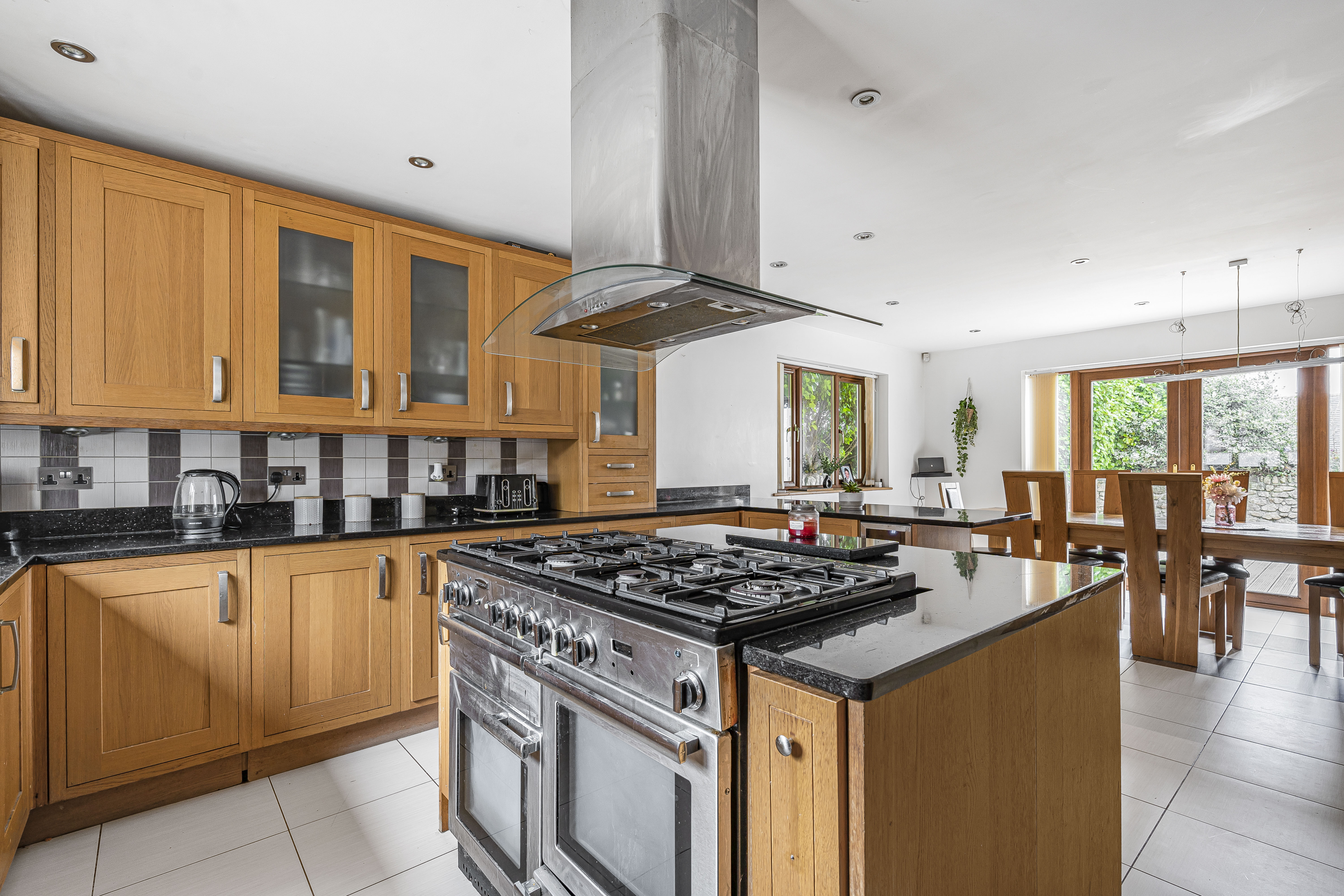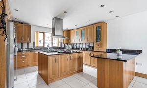 The kitchen is equipped with a modern fitted kitchen with a range of solid wood units and drawers under worksurfaces tiled splash backs with granite work surfaces, large kitchen island with space for large range master, inset stainless steel extractor hood, built-in dishwasher, space for large fridge freezer, tiled underfloor heating.