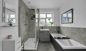 Accommodation comprises entrance porch and hallway with access to guest WC and stairs rising to the first floor, leading into a double length through reception room with attractive front aspect bay, modern feature fireplace, double doors to the rear onto the garden, and ample space for relaxing, entertaining and dining. The separate kitchen, extended to the rear with door onto the garden, comprises a high quality range of matching wall and base units, with work surfaces incorporating inset sink unit, electric hob with overhead extractor and oven below, and further space for appliances. To the first floor, there are three well proportioned bedrooms – two doubles and a single/study - plus a luxurious family bathroom with modern bath suite and separate walk-in shower unit. The second floor provides a large principal bedroom suite with stylish shower room, Juliette style balcony and access to useful remaining eaves space.
