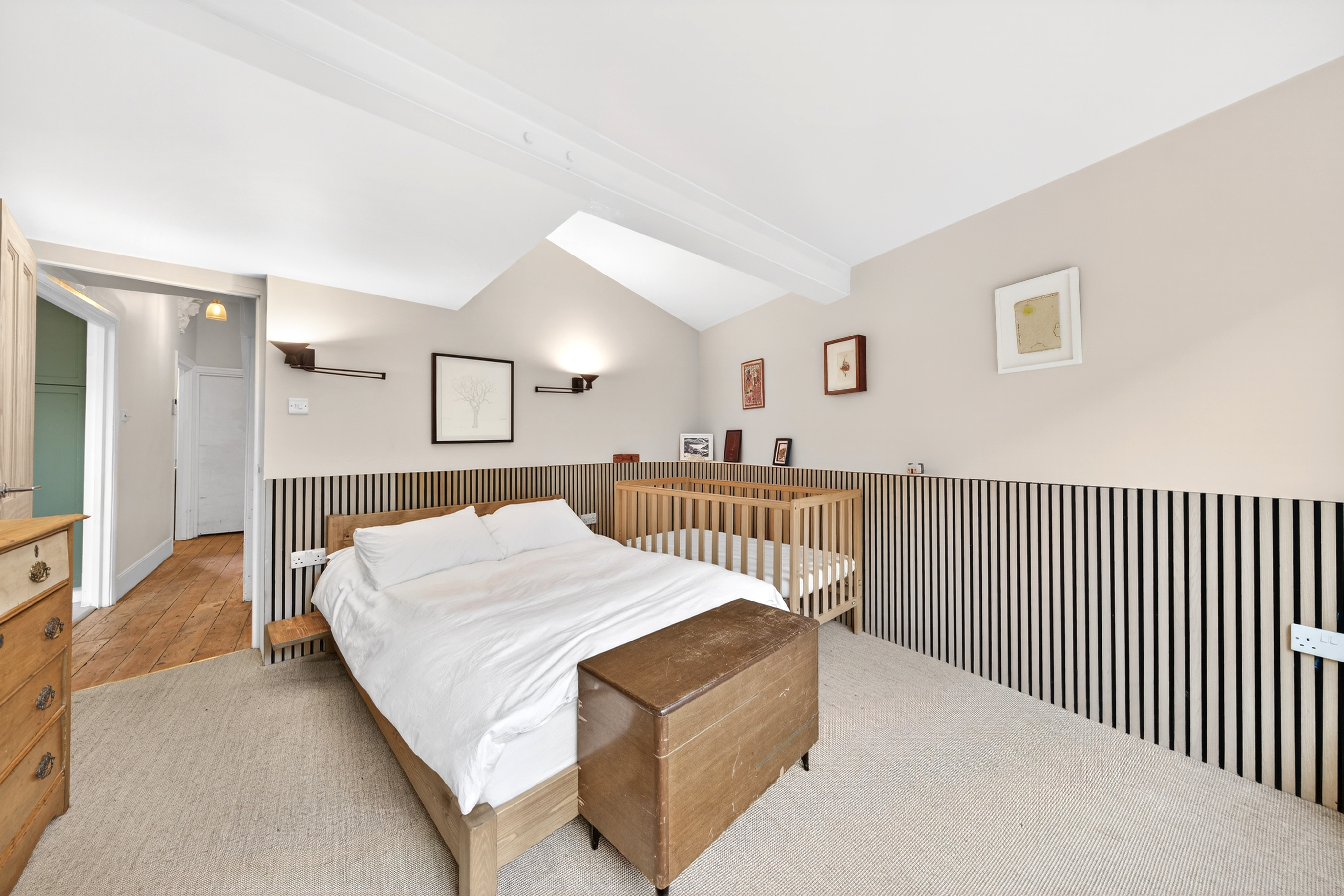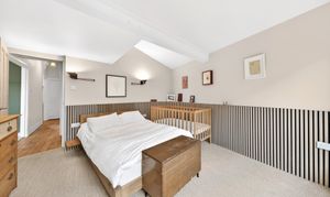The principal bedroom is generously sized and features stylish wooden panelling, a huge triple-glazed window looking out to the garden, and ample space for freestanding wardrobes and additional furniture.