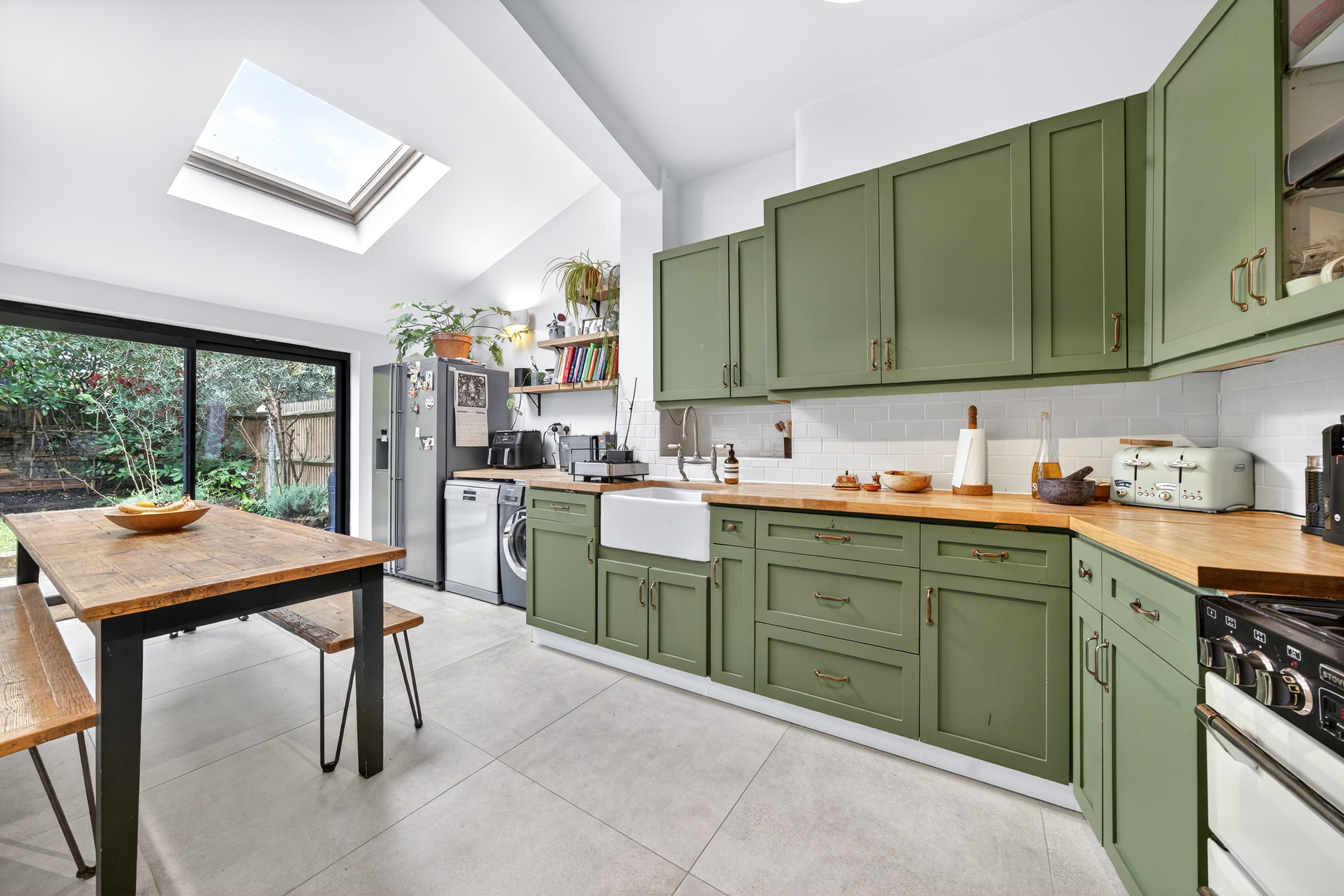 The kitchen has always been the heart of the home for us here — airy and spacious, with plenty of room to cook and a long table perfect for gathering friends, opening straight out into the garden, which gets a full day of sun in the summer months.