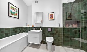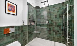 The new bathroom is finished to a high standard with deep green tiles, underfloor heating, a full-length bath and a separate walk-in shower.