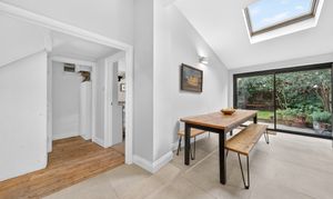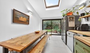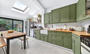 The kitchen extension enjoys a large skylight window that fills the room with natural light. The blend of period features with the contemporary kitchen design works beautifully, while also providing all the modern conveniences expected for everyday living.