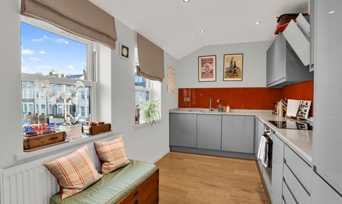 The accommodation comprises an entrance hall with large built-in storage; a bright, dual-aspect reception room that offers excellent space for both living and dining; separate modern fitted kitchen with integrated metro tiled splashback, and integrated appliances; spacious double bedroom and a modern bathroom with a skylight. All the Velux windows have integrated blinds.