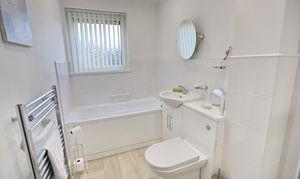 Upstairs, the property boasts three double bedrooms, each offering excellent proportions and flexibility for use as bedrooms, a home office, or guest accommodation. Bedroom one and three include free standing furniture and bedroom one also has a walk in wardrobe/storage area. The modern four piece bathroom suite includes a separate shower enclosure, a panelled bath, a wash basin, and a WC, all finished to a high standard.