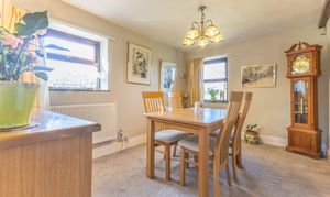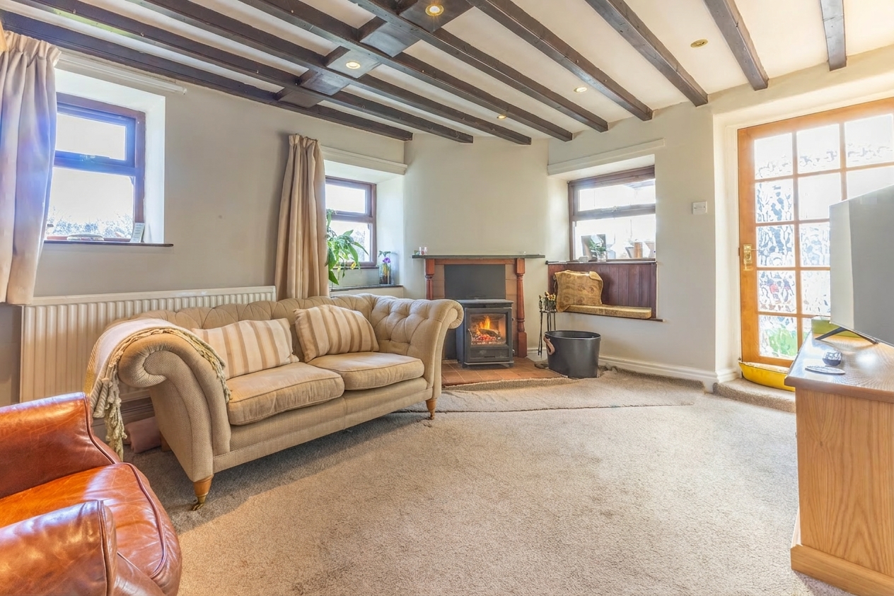 The accommodation is both spacious and full of charm, with two welcoming living rooms, each centred around a log burning stove and complemented by exposed beams and characterful detailing, creating warm and inviting spaces to relax and entertain. A separate dining room flows through to the rear living room and on to a light filled conservatory overlooking the garden, providing an ideal setting for family gatherings and enjoying the surrounding views throughout the seasons. The fitted kitchen is well appointed with ample storage and generous worktop space, with direct access to the garden enhancing the sense of indoor outdoor living. To the first floor, there are four well proportioned double bedrooms, all bright and airy with pleasant outlooks, served by a family bathroom. The property has been well maintained over the years and benefits from double glazing and oil central heating, and now offers excellent scope for a new owner to update and personalise to their own taste.