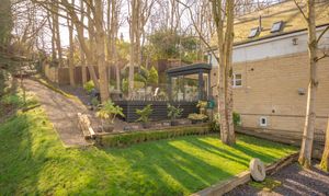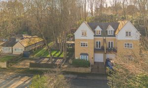 To the first floor, the landing gives way to a lovely lounge with a feature living flame gas fire and wooden flooring, alongside a formal dining room with French doors that open onto the raised balcony. At the heart of the home is the impressive dining/living kitchen, beautifully designed with high-quality Leicht units, Quooker Tap, quartz worktops, integrated Siemens appliances and a Danish wood burning stove as a focal point. Skylights and full-height sliding doors flood the space with natural light, with direct access onto a decked entertaining terrace.
