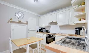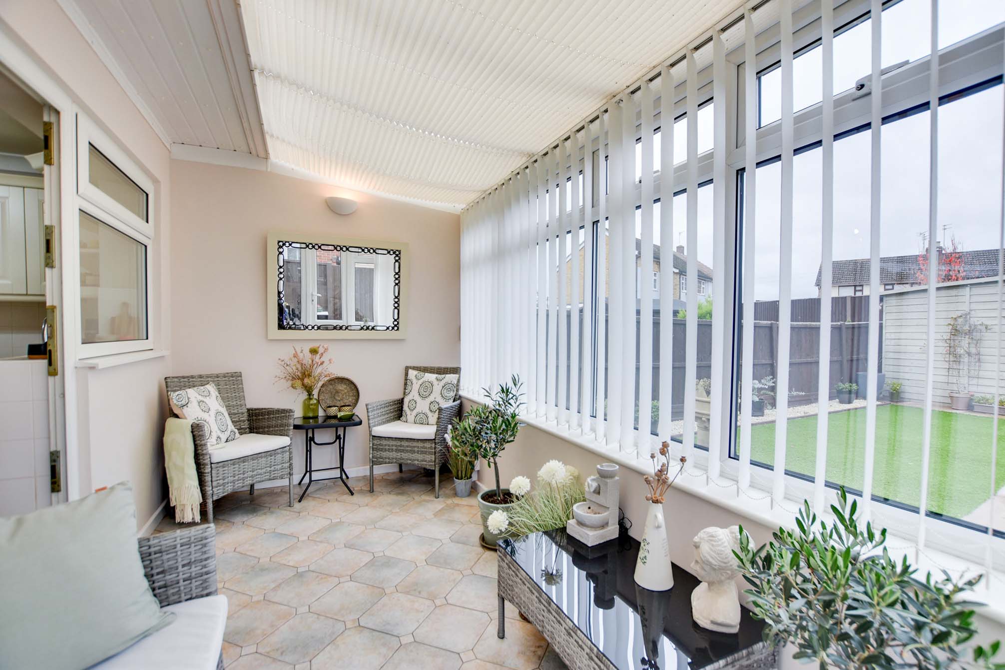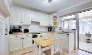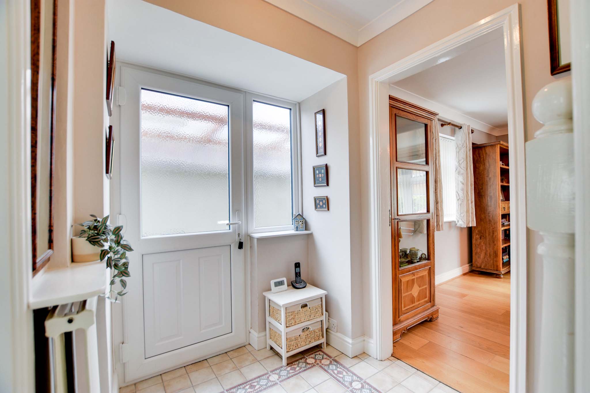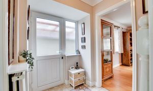with door to conservatory, under stairs pantry with meters, stainless steel sink and drainer unit with a range of wall and base units with work surfaces over, built-in oven and electric hob, built-in washing machine, built-in fridge and freezer, tiled floor, radiator.