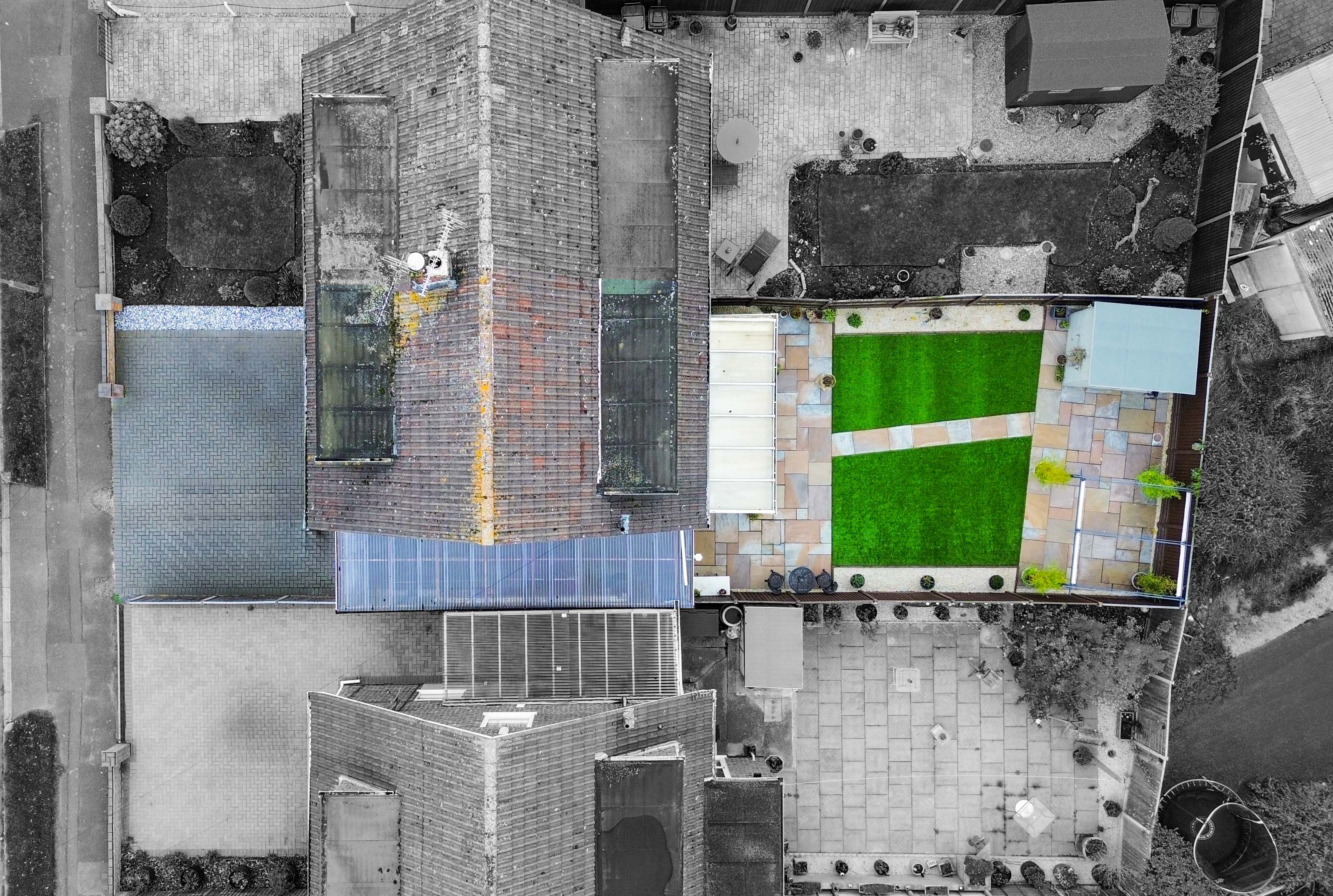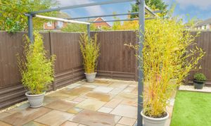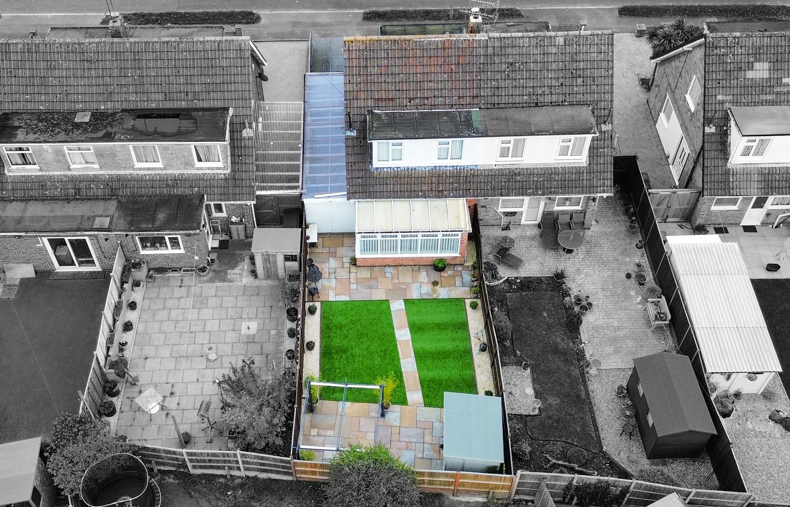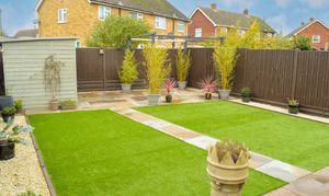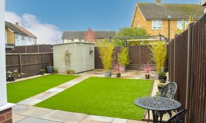 Paved patio, paved path leading into seated paved area with pergola, shed with power and lighting, and a slate-chipped rear garden with fencing to perimeter.