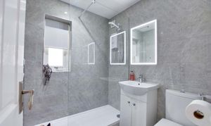 with double glazed window to rear elevation, walk-in double shower cubicle with electric shower, low level WC, wash hand basin, mirror, tiled walls, extractor fan, tiled floor, heated towel rail.