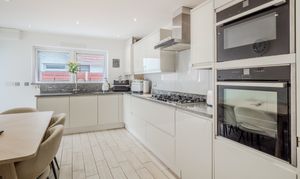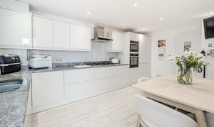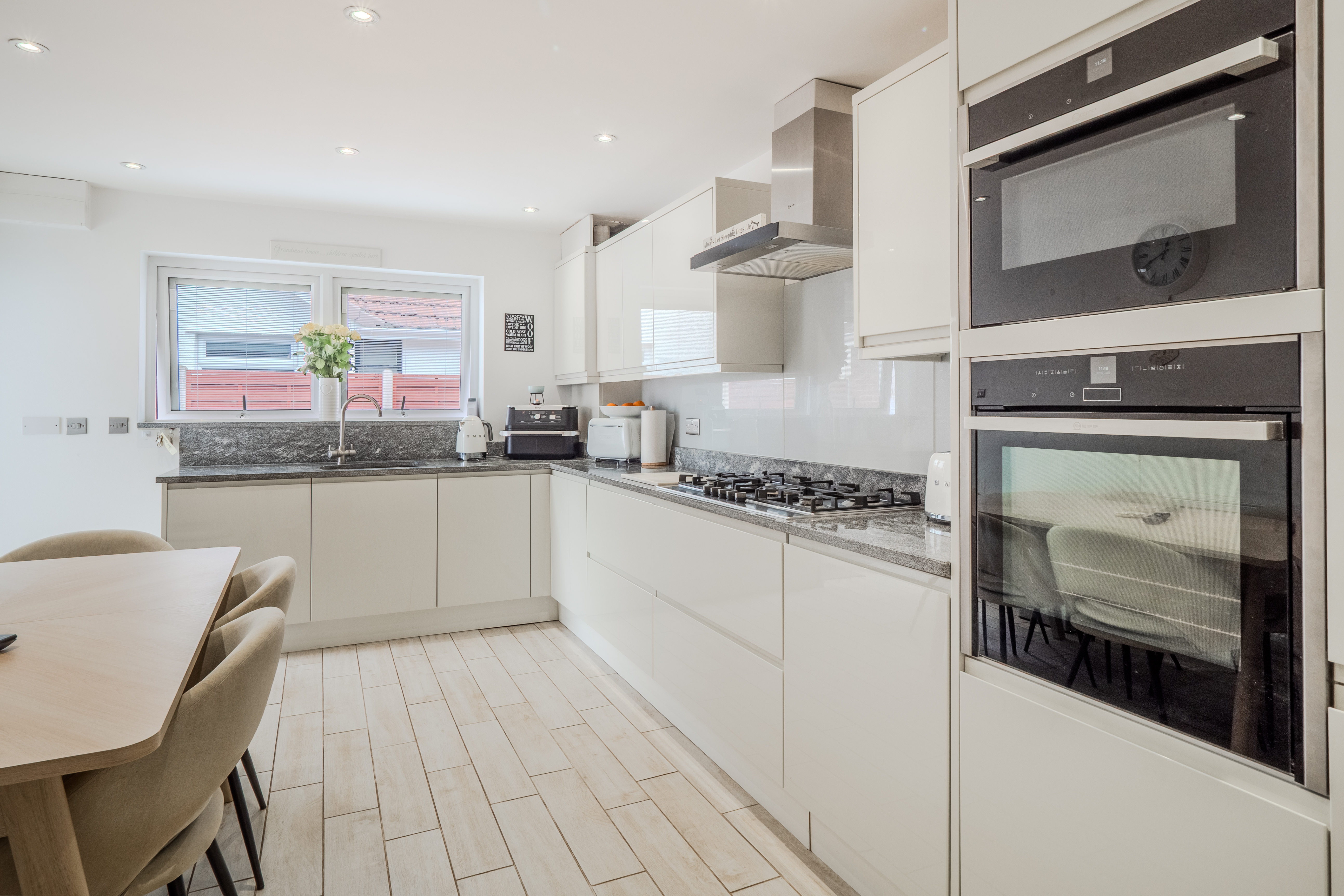 The kitchen/dining room is a modern and sociable space, fitted with a contemporary range of wall and base units topped with granite worksurfaces and matching upstands. There is a built-in eye-level electric double oven, five-ring gas hob with extractor above, and integrated larder fridge, dishwasher, and washing machine. A wall-mounted cupboard houses the ‘Worcester’ combi boiler. The room is finished with tiled flooring, a radiator, and UPVC double glazed window and door opening to the rear garden.