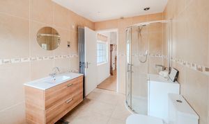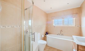 The family bathroom is fully tiled and thoughtfully laid out with a panelled bath, a separate shower quadrant, vanity unit with inset basin, and low level W.C.