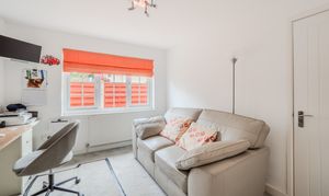 The sitting room is bright and welcoming, with engineered oak flooring, a wall-mounted flueless gas fire, and an upright radiator. Bi-folding double glazed doors open directly onto the rear garden, offering a seamless connection to the outdoor space. The principal bedroom is a generous double with engineered oak flooring and has a pretty aspect overlooking the rear garden. A door leads through to a fully tiled en suite shower room.