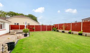 The rear garden is fully enclosed with timber panel fencing and benefits from gated access to the front. Wonderfully private and enjoying a sunny, south-facing aspect, the space is thoughtfully designed with an attractive paved patio stretching across the width of the property—ideal for entertaining or relaxing. A second paved area sits just behind the garage, providing additional seating or storage options. A level lawn runs through the centre, bordered by planting along the rear fence.