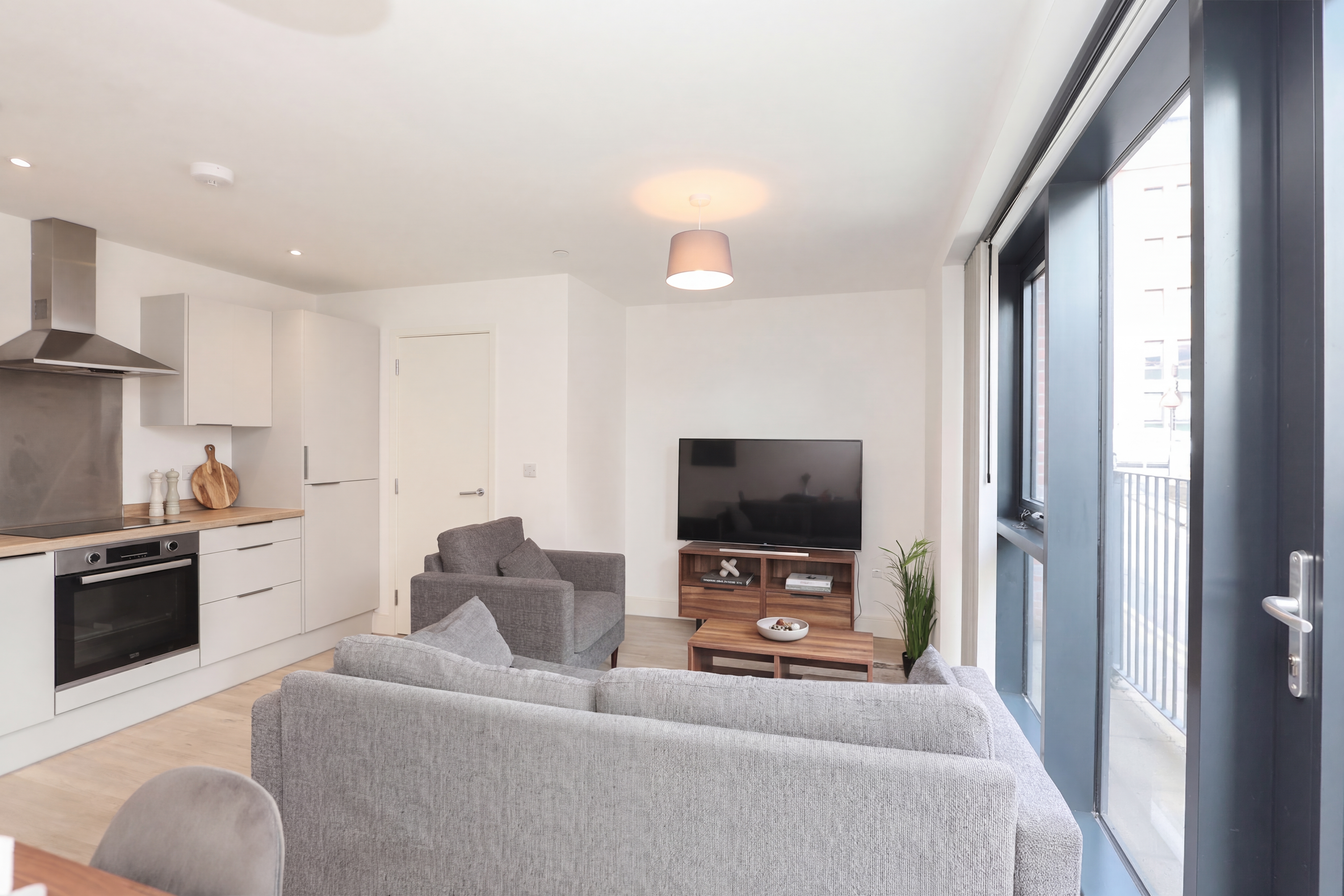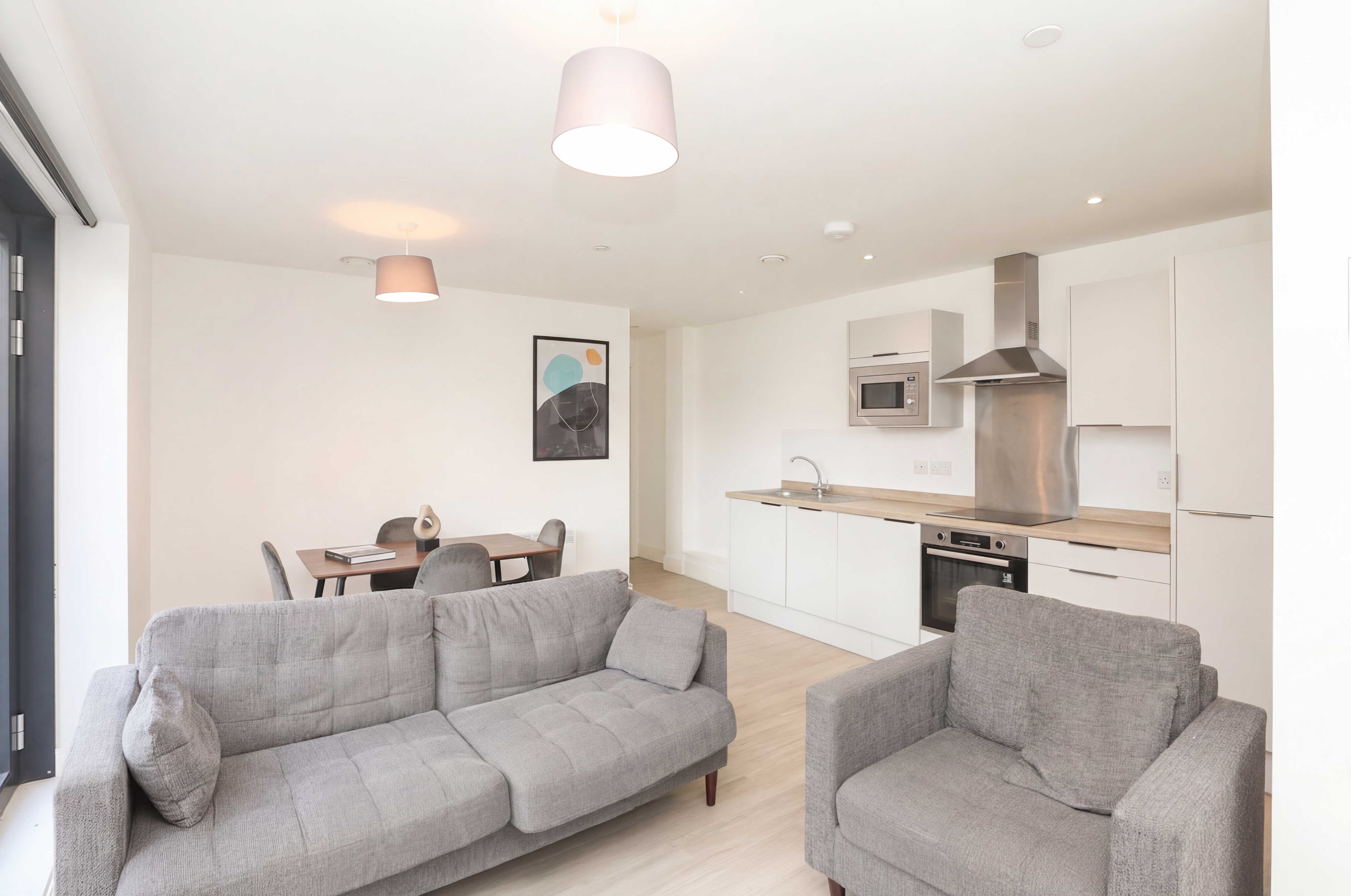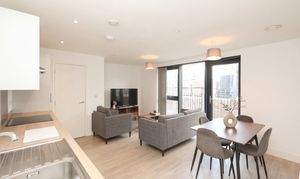 This ground-floor two-bedroom apartment provides generous, modern living spaces for the urban dweller. With a luxury, fully tiled bathroom, an on-trend kitchen with a range of integrated appliances including dishwasher, microwave, hob, oven, and fridge-freezer, plus light and airy bedrooms with minimalist wardrobes.