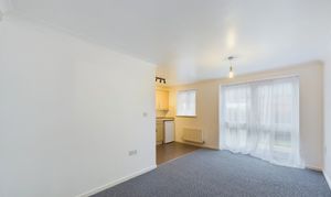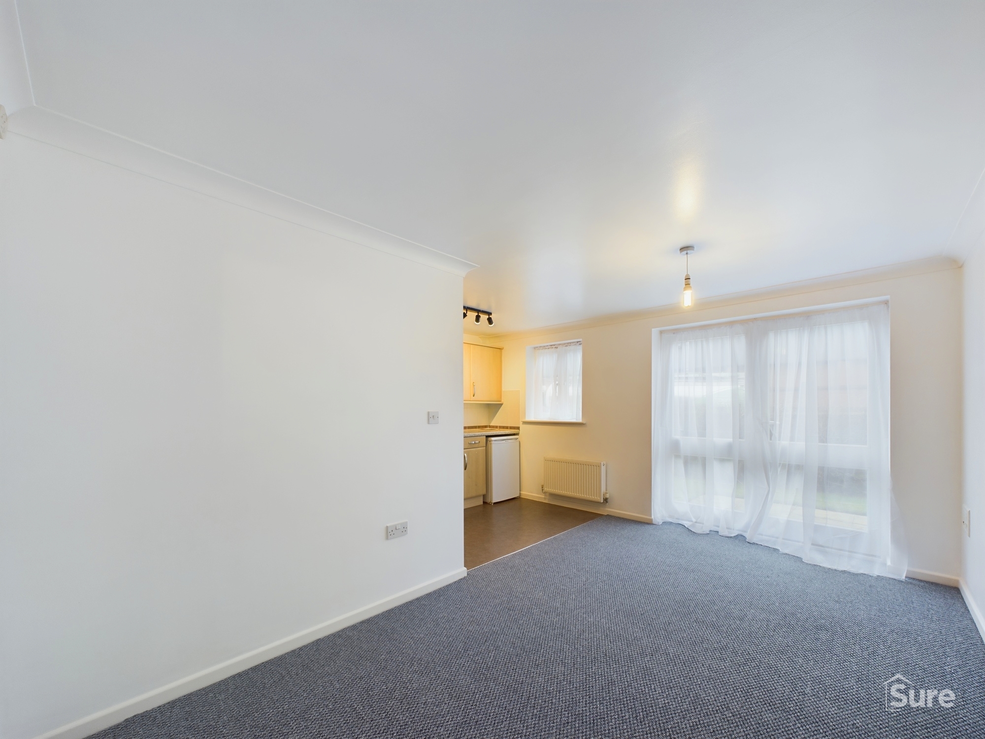 The spacious lounge/dining area benefits from double doors opening directly to the outside, creating a bright, open feel with easy outdoor access. The kitchen, open to the lounge, features contemporary wall and base units, a cooker, hob, fridge, and space for additional appliances.