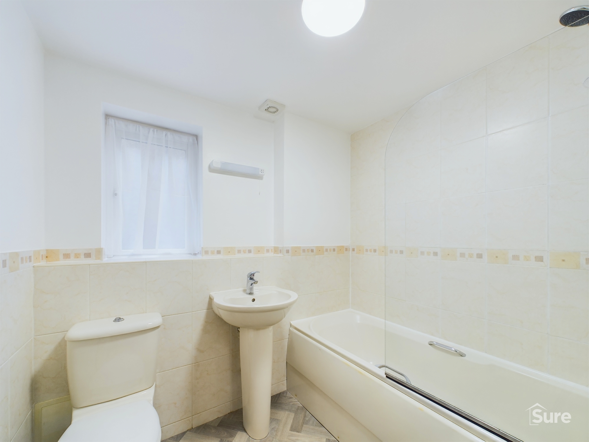 At the end of the hallway, there’s a generous three-piece bathroom, complete with a shower over the bath, a low-level W/C, and a wash hand basin.