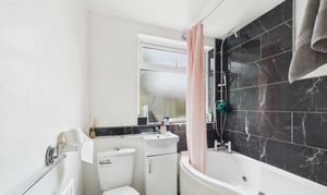 Window to rear. Having a suite comprising bath with shower over. Wash hand basin with cupboard under, low level WC, radiator.