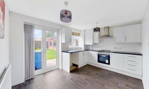 The accommodation briefly comprises an entrance hall with a fitted security alarm, a bright lounge with useful under-stairs storage, and a modern open-plan kitchen/diner featuring French doors that open out onto the rear garden—perfect for entertaining.
