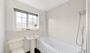 To the first floor is a contemporary family bathroom with a three-piece suite and overhead shower, a well-proportioned second bedroom, and a spacious master bedroom complete with built-in storage.