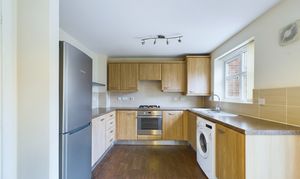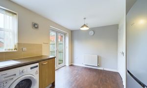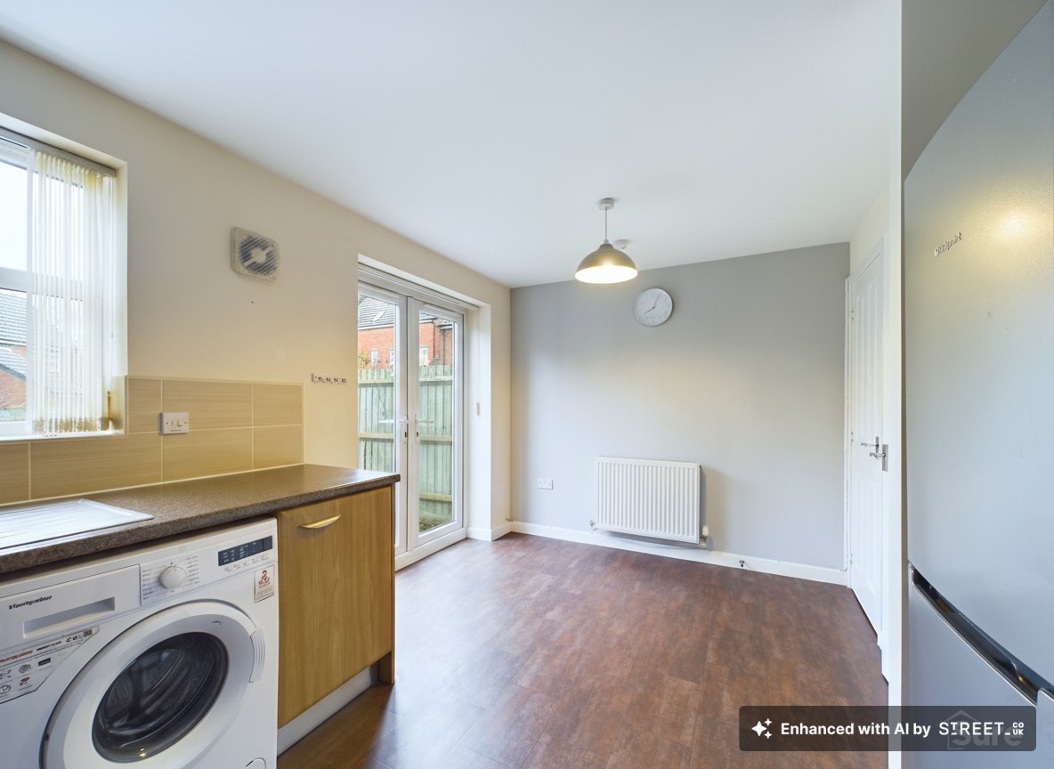 Window and French door to rear. Having a range if wall and base units with contrasting working surfaces and inset stainless steel sink and drainer. Built in electric oven, gas hob and extractor hood over. Washing machine point. Under stairs storage cupboard. Radiator.