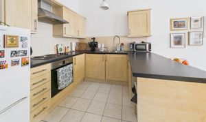 Two windows to front. Having a range of fitted wall and base units with contrasting working surfaces and inset stainless steel sink and drainer. Built in electric oven, hob and extractor hood over. Washing machine point. Wall heater.