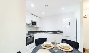 The modern fitted kitchen includes integrated appliances, ample cupboard and worktop space, and comes fully equipped.