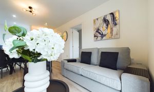 The open-plan living and kitchen area is bright and well laid out, with pleasant views overlooking the communal gardens. All furniture shown in the photos is included.