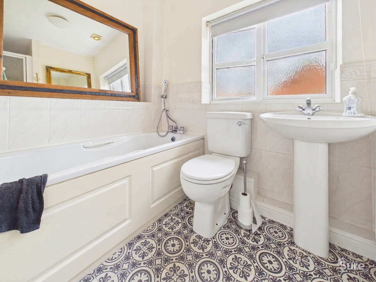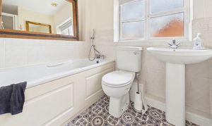 Window to rear. Having a three piece suite comprising bath with shower attachment, pedestal wash hand basin and low level WC, radiator.