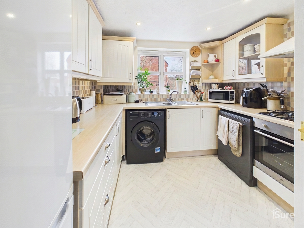Window to rear. Having a range of fitted wall and base units with contrasting roll edge working surfaces. Inset stainless steel sink and drainer. Built in electric oven, gas hob and extractor hood over. Washing machine point.