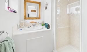 Window to front. Shower cubicle, wash hand basin set into vanity style unit, radiator.