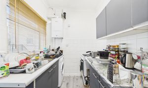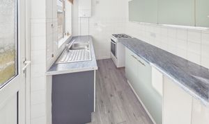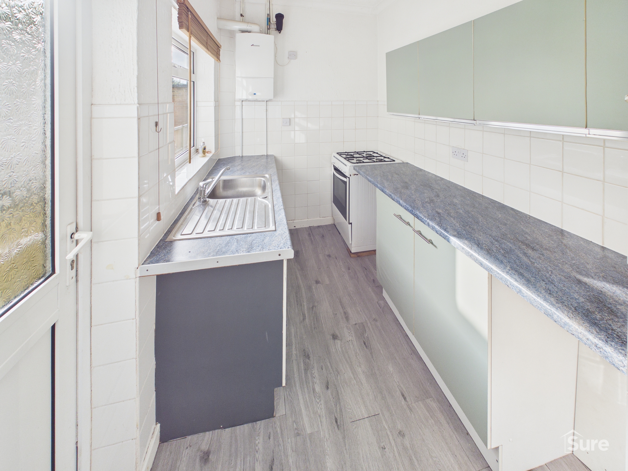 Window and door to side. Wall mounted gas boiler. Wall and base units with inset stainless steel sink and drainer. Gas cooker point and washing machine point.