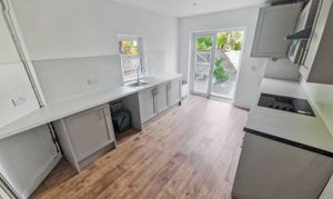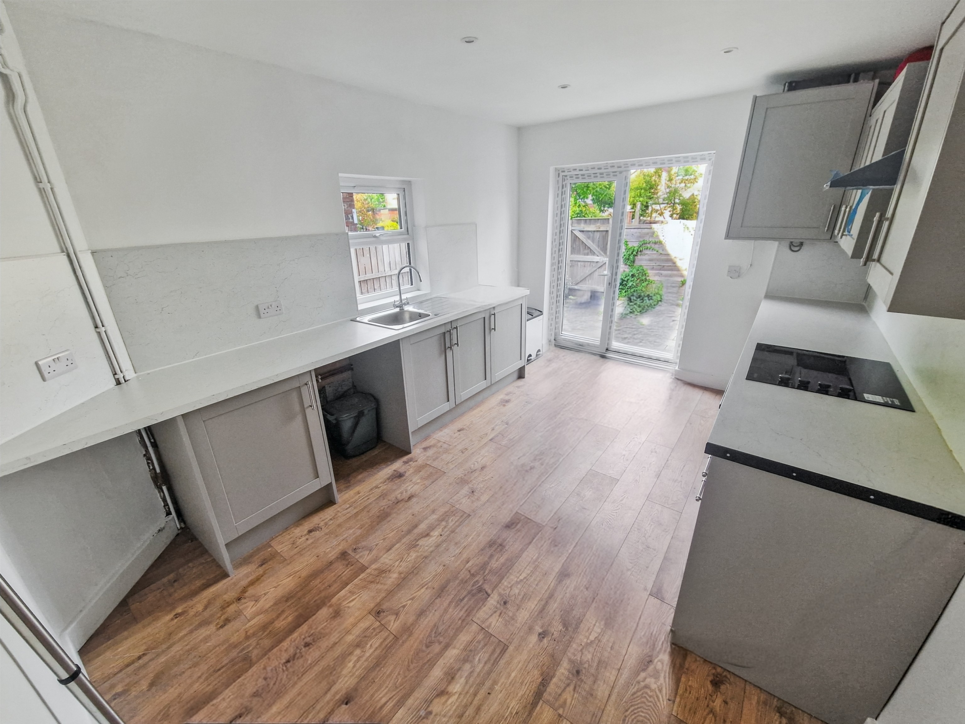 On the ground floor, the entrance hallway leads to a bright and spacious bay-fronted lounge overlooking the front garden. A second reception room offers an ideal dining space with useful understairs storage, and from here, you step into the modern kitchen. Fitted with a range of wall and base units, the kitchen is both stylish and practical, with patio doors opening directly onto the rear yard—perfect for entertaining and outdoor dining.