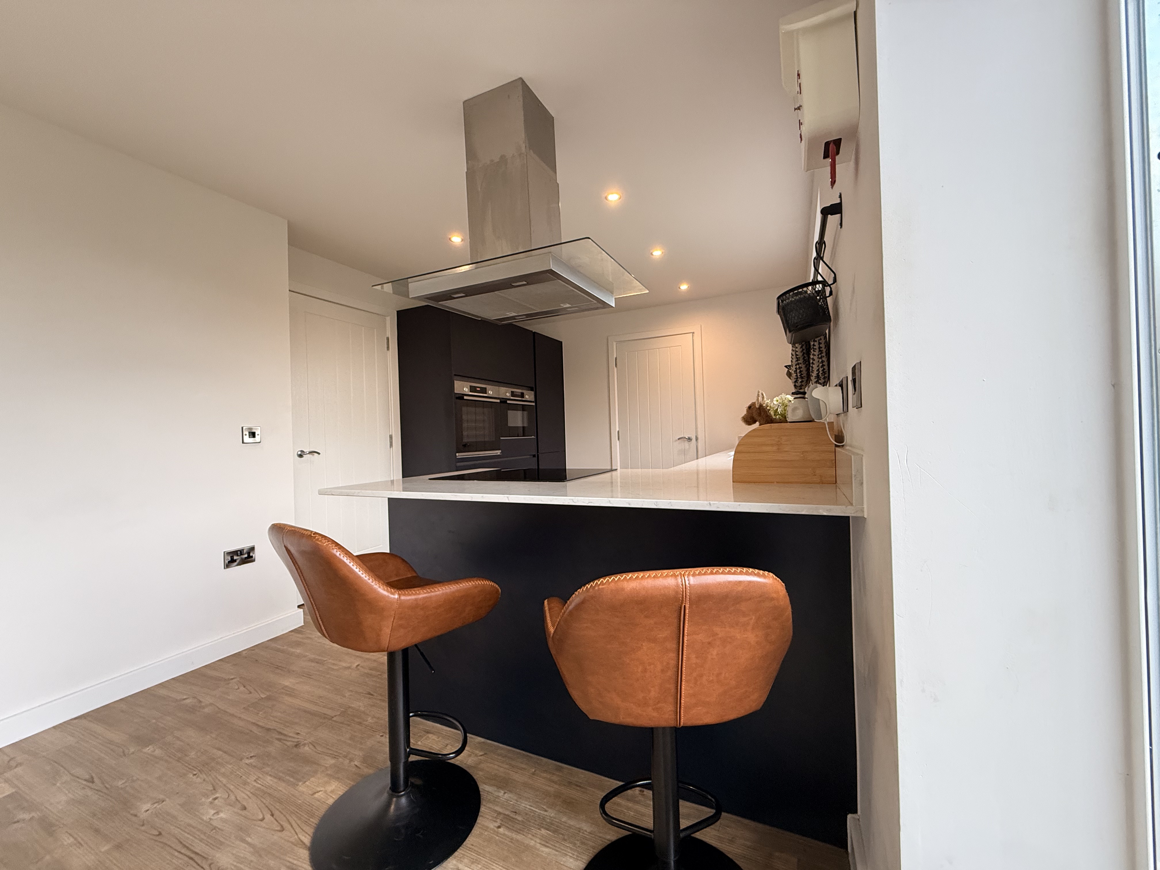 Inside, a welcoming hallway with Amtico flooring leads to a stunning open-plan kitchen and dining area, designed with modern family living in mind. Bi-folding doors open onto the garden, allowing a seamless flow between indoor and outdoor spaces. The kitchen is fitted with a range of wall and base units and features an impressive selection of integrated Bosch appliances, including a fan oven, microwave, island hob with extractor, washing machine, and Candy tumble dryer. A convenient downstairs guest WC completes the ground floor layout.