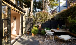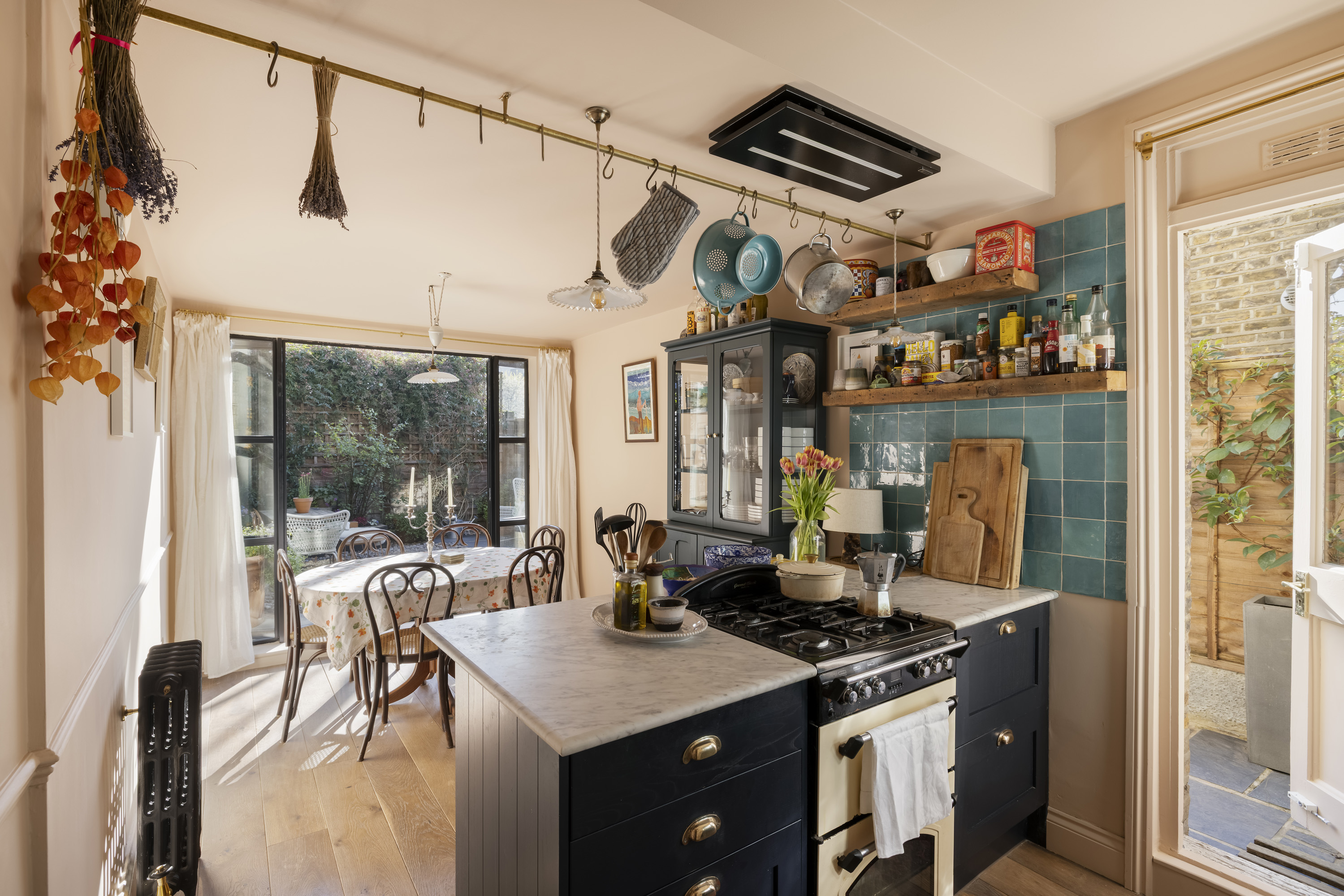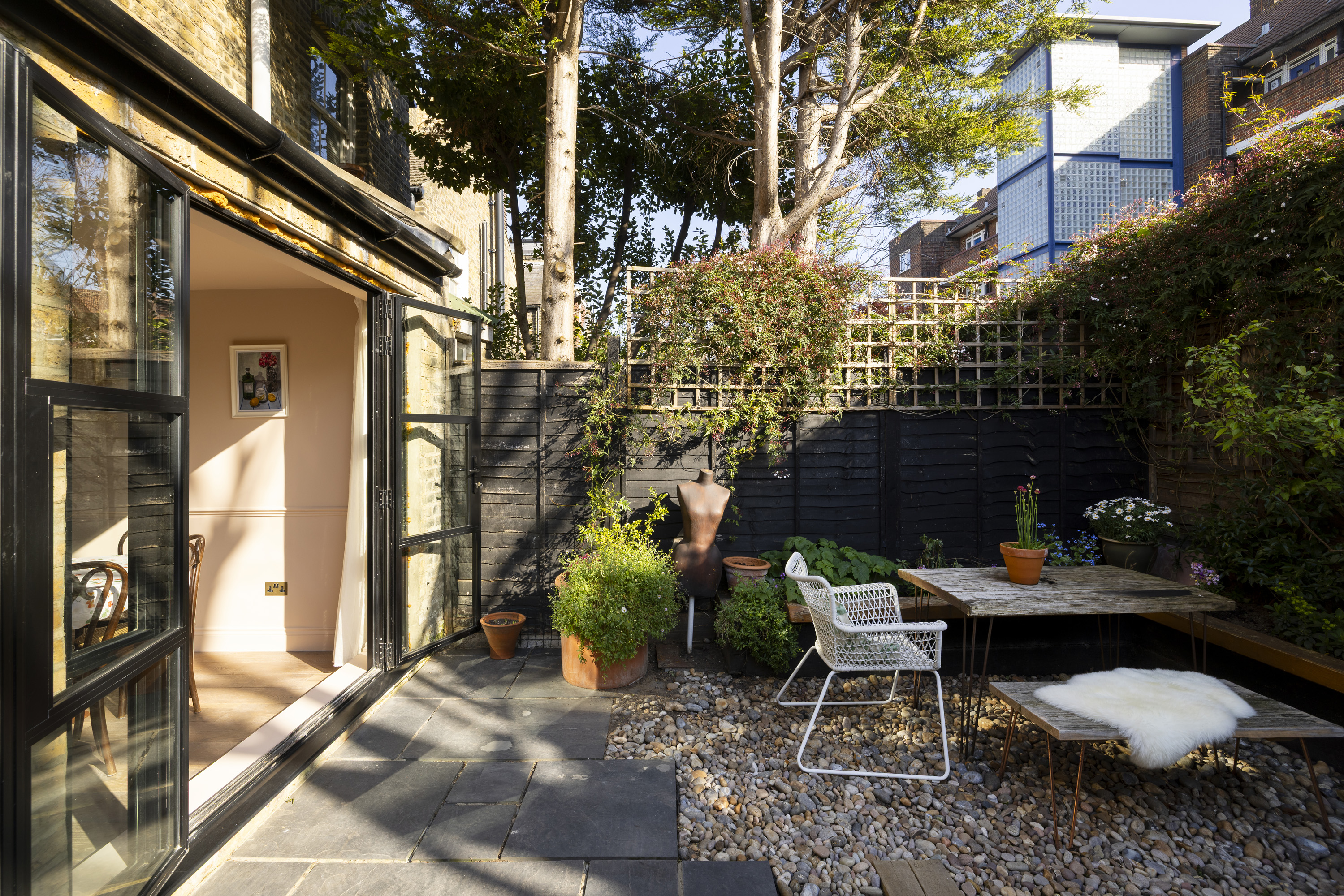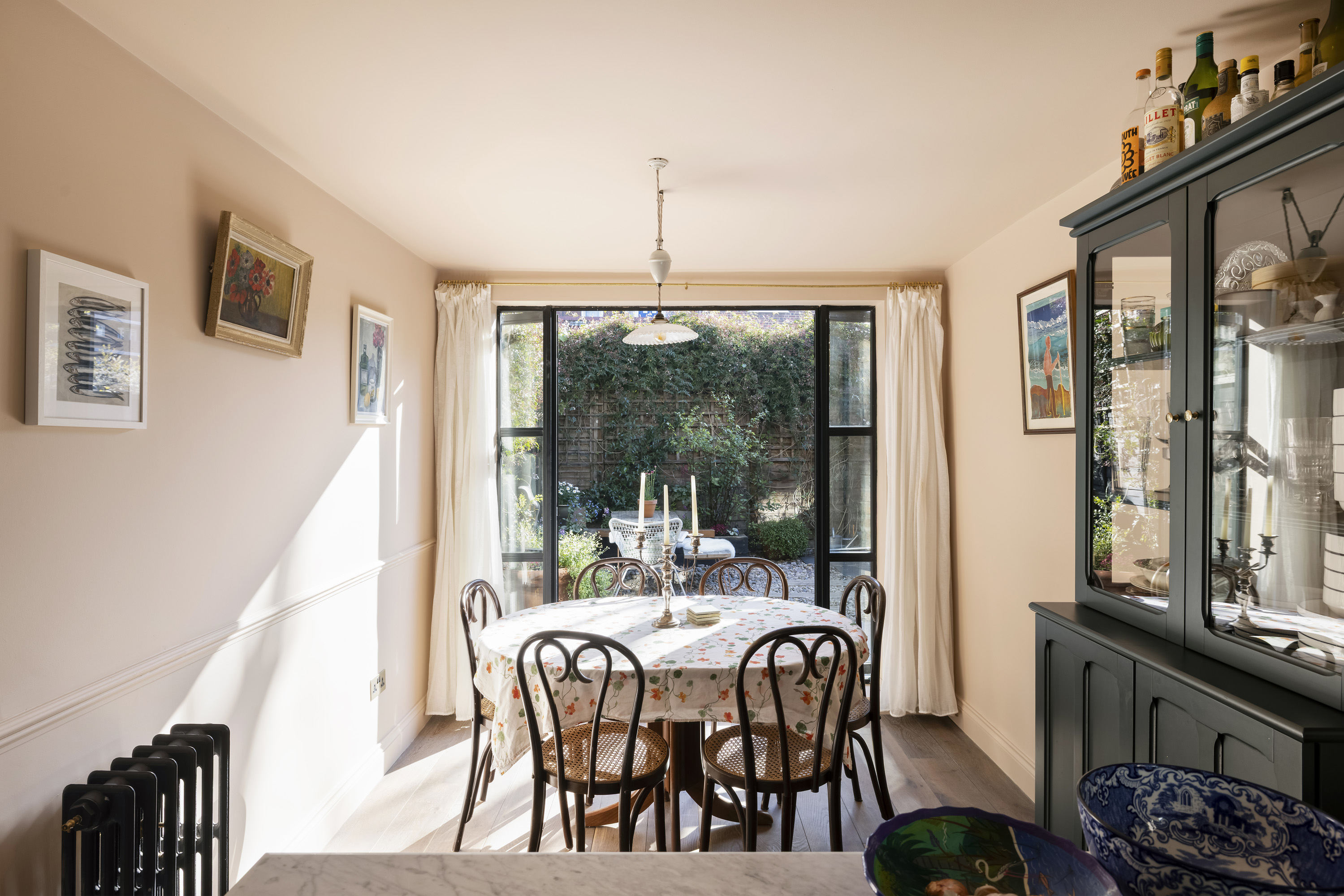 Double doors lead out to the garden, creating a natural extension of the living space and a lovely setting for both quiet mornings and relaxed evenings with friends.